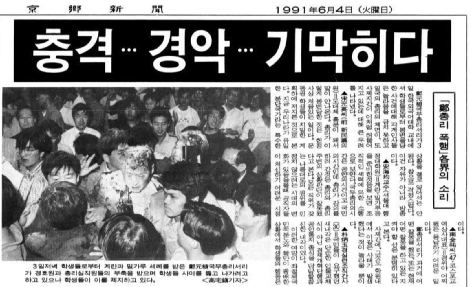 1991년 외대 학생들은 정원식 총리에게 전교조 교사 해직에 대한 항의로 계란과 밀가루를 투척했다. 이 항의의 음식은 계란과 밀가루를 뒤집어쓴 총리 사진을 대문짝만하게 신문들을 도배했다. 당시 강경대 학생 치사사건 등으로 수세에 몰리고 있던 노태우 정권은 이 정원식 총리 밀가루 사건을 통해 투척 학생들을 단죄하며 단숨에 정국을 자신들에게 유리한 국면으로 뒤바꿨다. 항의의 음식이 결국 투척 대상에게 상징적 피해를 주는 대신 투척자들과 그 진영 전체에 거대한 물리적, 상징적 피해의 부메랑으로 돌아온 사건이다.