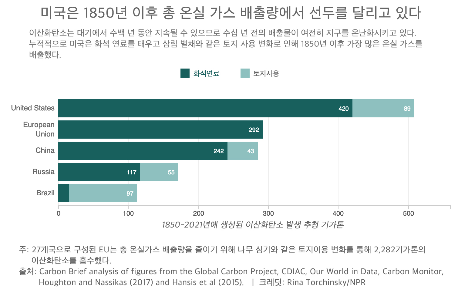 중국은 현재 가장 높은 배출량에서 1위를 차지하고 있지만 역사가 중요하다. 이산화탄소는 일단 배출되면 대기 중에 수백 년 동안 지속되어 지구 온도를 높이는 열을 가둘 수 있습니다. 이는 지난 150년 동안 화석 연료를 태울 때 발생하는 배출물이 오늘날 일어나고 있는 온난화의 원인임을 의미한다. 그 기간 동안 미국의 누적 배출량이 가장 많았다.