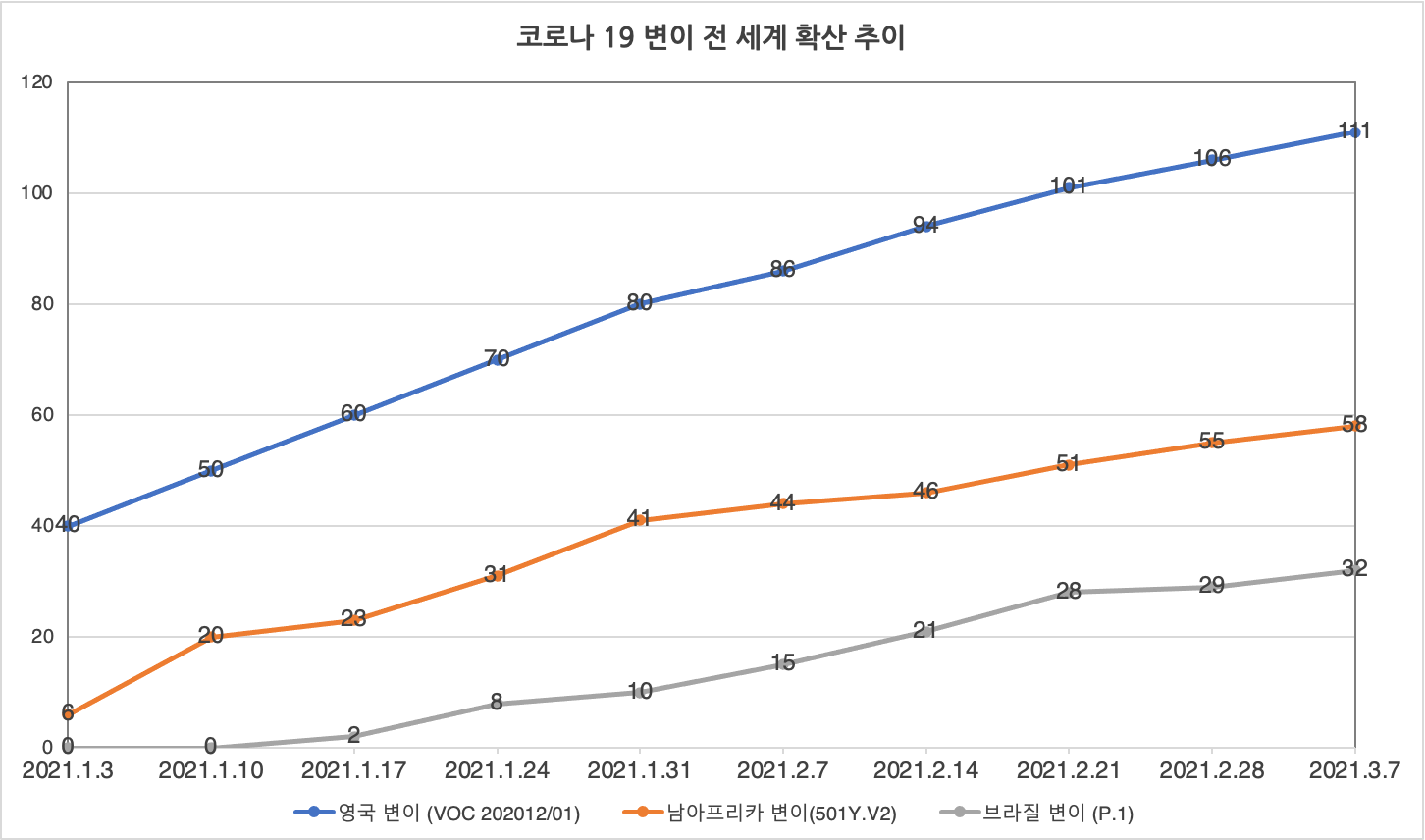 영국과 남아프리카 변이는 2021년 1월 초 각각 40개국과 6개국에서 보고됐고, 현재는 각각 11개국과 68개국으로 확산됐다. 브라질 변이는 2021년 1월 17일 2개국에서 보고됐던 것이 3월 7일 현재 32개국으로 확대됐다. 3월 들어 브라질이 세계 최대 감염국이 된 것은 이 변이의 확산과 무관하지 않다. 이 변이들은 국가별로 확산될 뿐만 아니라 간헐적 사례 보고에서 지역감염으로 확대되는 경향 또한 증가하고 있다. 이미 2월 21일 영국 변이는 45개국, 남아프리카 변이는 13개국, 브라질 변이는 3개국에서 지역감염이 보고됐고, 적지 않은 국가들이 지역감염 여부를 판단 중이어서 지역감염 사례는 더 늘어날 것으로 보인다.
