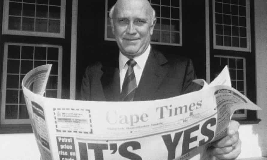 데 클레르크는 11년 전 옵저버(Observer)와의 인터뷰에서 “우리가 했던 방식으로 변하지 않았었다면 남아프리카는 완전히 고립되었을 것입니다. 세계 대다수의 사람들은 정부를 전복하려 했을 것입니다. 우리 경제는 존재하지 않을 것입니다. 우리는 단 한 상자의 와인도 수출하지 못했을 것이고 남아프리카 공화국의 비행기는 어디에도 착륙할 수 없었을 것입니다. 내부적으로는 내전에 버금가는 상황에 처하게 됐을 것입니다.”