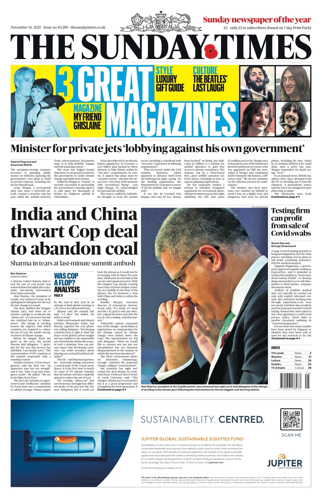 Independent는 1면 전체를 COP26에 할애했으며, 인도와 중국의 압력으로 합의가 결렬된 것에 대해 사과하는 정상회담 의장인 영국 장관 COP26 의장 알록 샤르마(Alok Sharma)를 헤드라인으로 썼다.