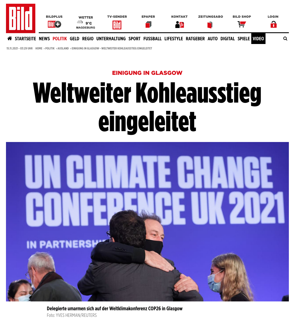 독일 최대 일간지인 타블로이드 Das Bild는 "Weltweiter Kohleausstieg eingeleitet"(전 세계적 석탄 하차 개시)로 헤드라인을 장식했다. Das Bild는 비록 언어가 다소 희석화되었지만 COP26이 석탄과 화석 연료에 대해 구체적인 결정을 내린 것은 이번이 처음이라는 점을 강조했다.