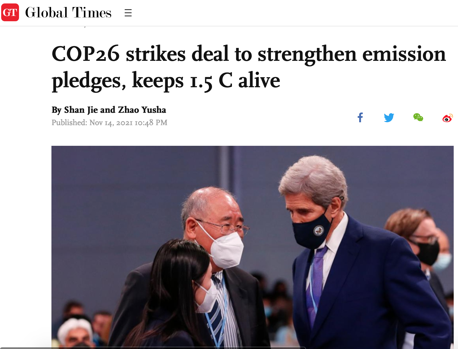 Global Times(중국어로 環球時報)는 "COP26, 배출 공약 강화하기 위한 협약 체결, 1.5도 유지"라는 제목의 기사에서 일요일에 성명을 발표한 중국 생태환경부의 논평을 통해 COP26이 순조롭게 마무리됐다고 밝혔다.