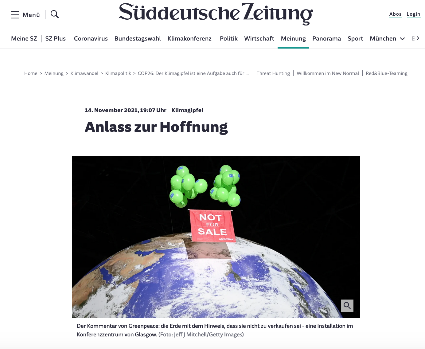 정론지 Süddeutsche Zeitung은 "Anlass zur Hoffnung"(희망의 동기)라는 제목으로 COP26을 다루었다. Süddeutsche Zeitung은 "글래스고 회의는 석탄, 석유 및 가스의 대체를 시작한 사건으로 역사에 남을 수 있다. 말 뒤에 행동이 따른다면 말이다."라는 소제목으로 COP26의 역사적 의미를 부각했다.