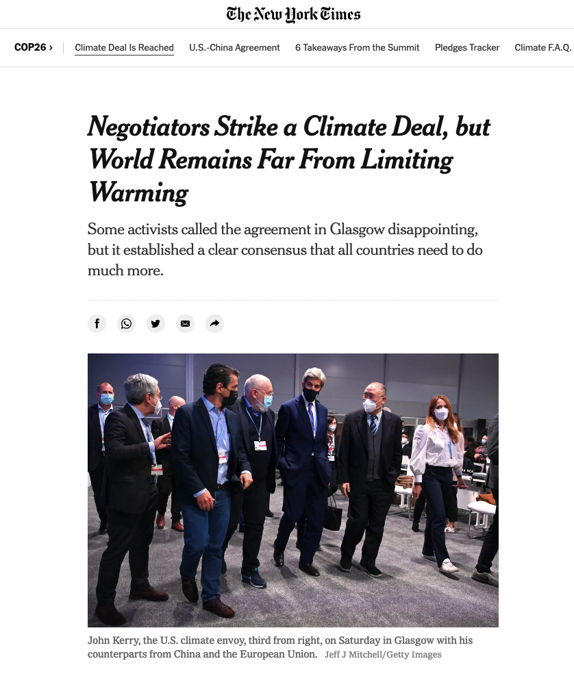 전 세계 언론은 최악의 기후 위기를 방지하기 위해 약 2주간에 걸친 유엔 기후변화협약당사국총회(COP26) 끝에 11월 13일에 발표된 글래스고 기후 협약(Glasgow Climate Pact)에 대한 의견을 제시했다. 일부는 이 협정이 기존의 기후변화협약당사국총회(COP)와 달리 석탄과 같은 화석연료의 감축에 대해 구체적인 내용을 포함하고, 기후 위기의 심각성에 따라 산업화 이전보다 섭씨 1.5도(화씨 2.7도)를 초과하는 것을 방지하는 것의 중요성을 확인했다는 점에서 환영하고 있다. 하지만 많은 언론들은 이 협약이 공허한 립서비스 수준에 머물고 있는 것에 대해 비판적이었다.