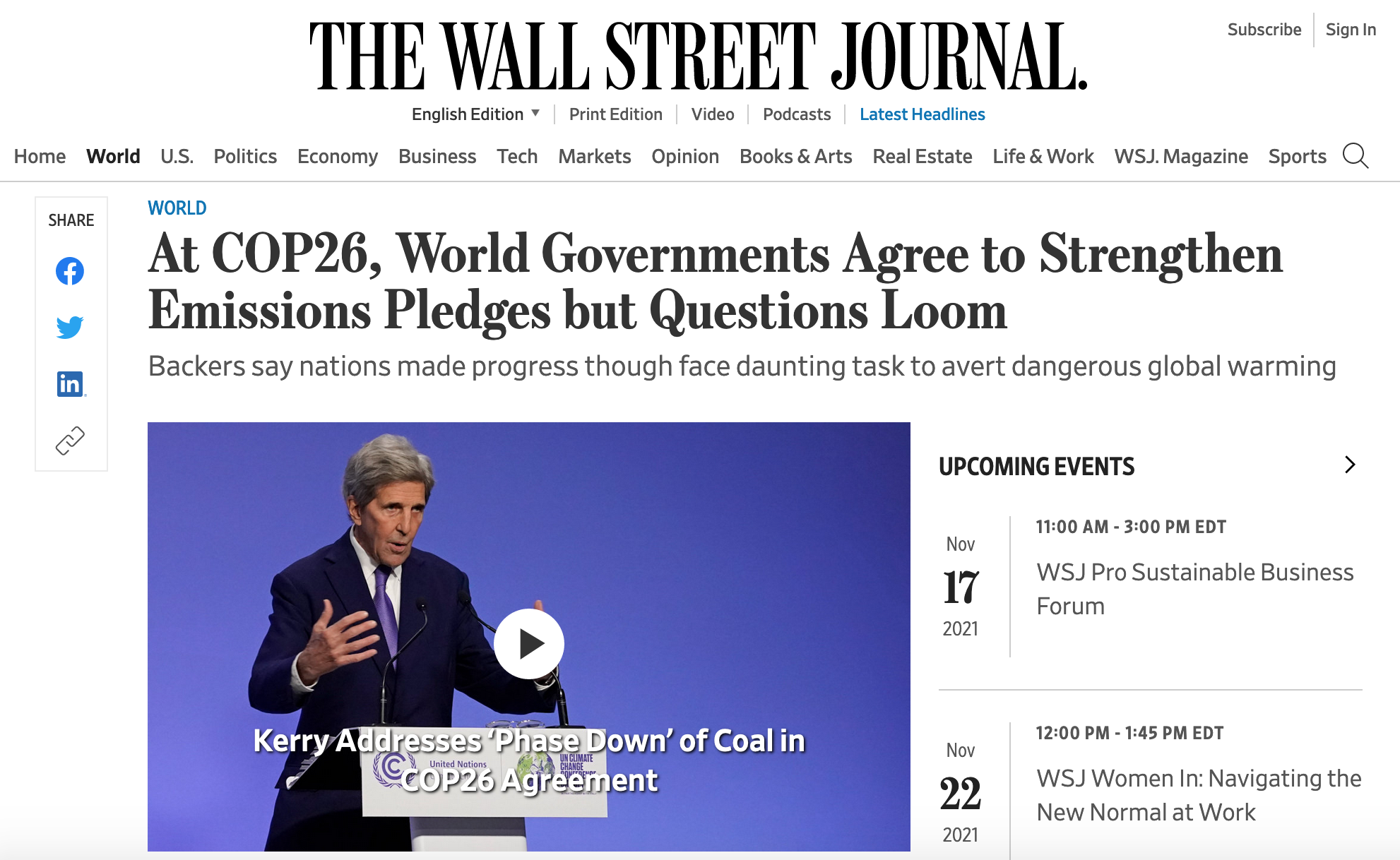 Wall Street Journal은 “세계 정부들은 배출량 공약의 강화에 동의하지만 의문점이 도사리고 있다”는 제목으로 이 협정을 둘러싼 일부 회의적인 시각을 강조했다.