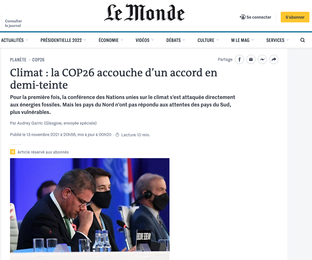 프랑스의 Le Monde는 "La COP26 accouche d'un accord en demi-teinte"(COP26은 엇갈린 합의를 낳다)라는 제목으로 조심스럽게 COP26이 기대에 미치지 못했음을 지적했다. 르몽드는 COP26이 "처음으로 유엔 기후 회의는 화석 연료를 직접적으로 다루었다. 그러나 북쪽의 국가들은 더 취약한 남쪽의 국가들의 기대에 부응하지 못했다."라고 지적했다.