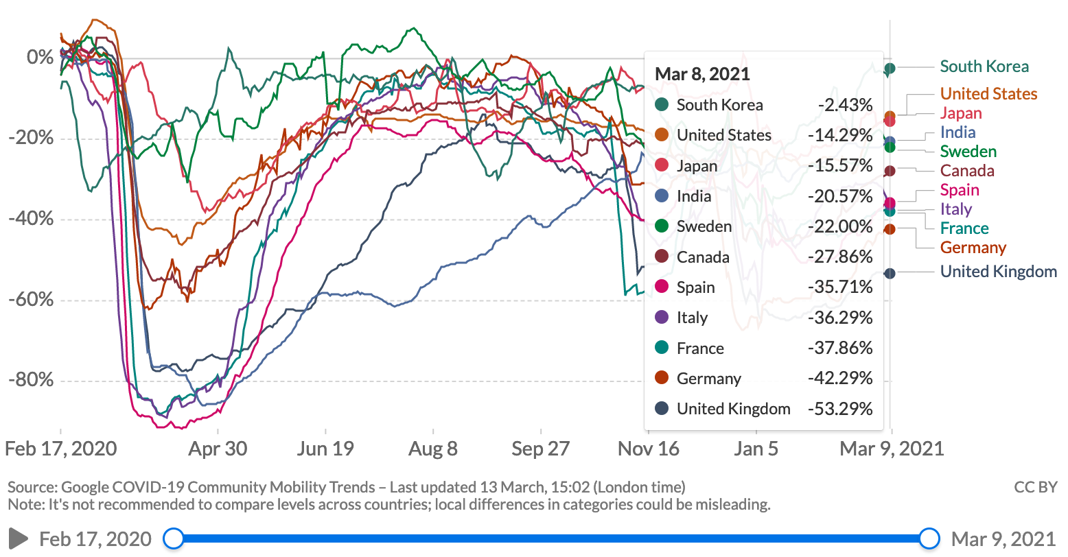 봉쇄와 사회적 거리두기는 인간의 활동에도 적지 않은 영향을 미쳤다. 가령 아래 그래프에서 보듯 2021년 2월 중순과 비교해 식당, 박물관, 공연 장소 방문 비율은 높게는 50% 이상 적게는 2% 정도까지 감소했다.
