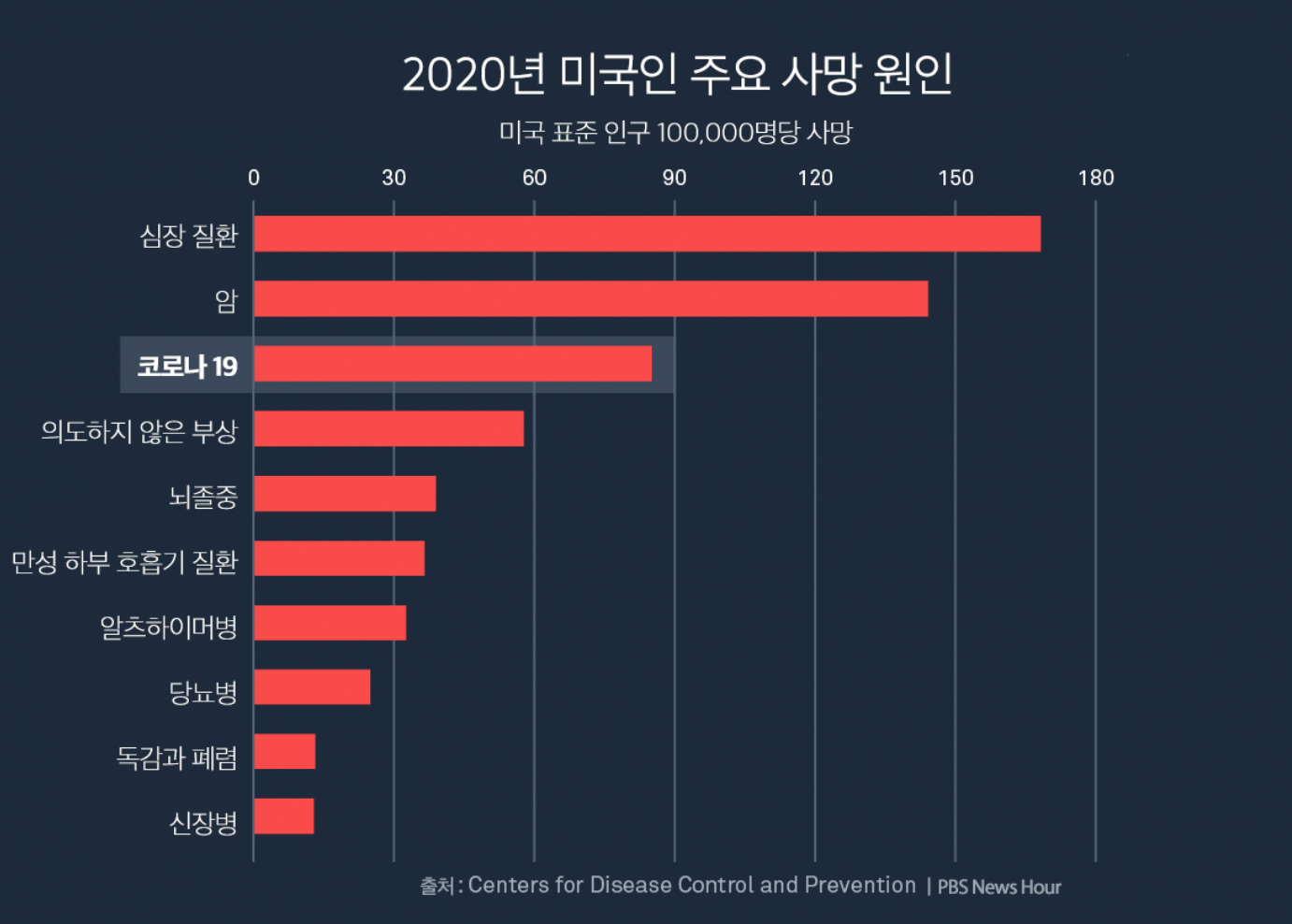 수요일 발표된 최신 연방 사망률 데이터에 따르면 코로나 19는 2020년 미국인의 평균 기대 수명(life expectancy)에서 1.8년을 줄이는 데 일조했으며, 이는 제2차 세계 대전 이후 미국인 수명의 가장 큰 변화를 나타낸다. 그 잔인한 한 해 동안 코로나 19는 미국에서 세 번째로 흔한 사망 원인이 되었으며 10명 중 1명이 이 바이러스로 사망했다.