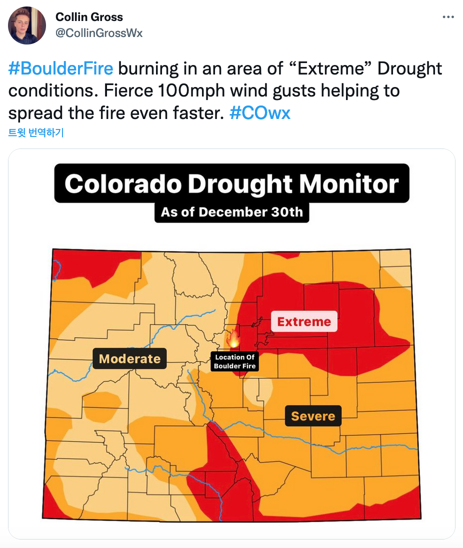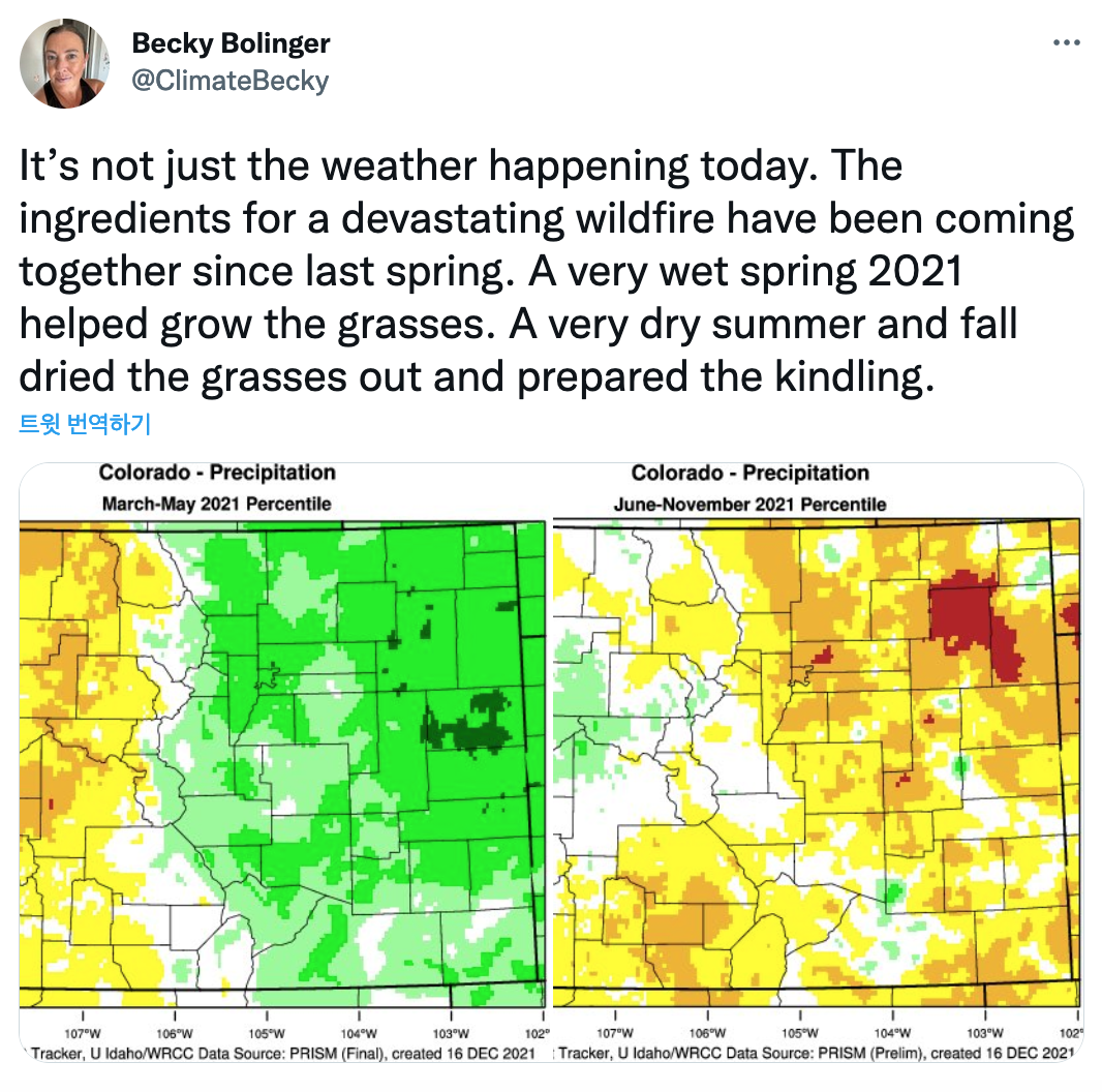 * 역자 주: 기후 변화가 지난해 최악의 미국과 캐나다 서부의 폭염과 독일 등 유럽 홍수의 원인이었음은 이제 의심의 여지가 없다. 기후 변화의 영향은 이렇게 극적인 형태로 나타나지만 이번 콜로라도 산불은 기후 변화가 인간이 계산하고 예측할 수 없는 방향에서 점진적으로 준비되었다. 2021년 봄의 풍부한 강우가 산림과 초원에 수분을 제공해 무성한 산림과 푸른 초목을 키웠지만, 여름의 폭염과 수년간의 가뭄은 이 산림과 초목을 산불의 잠재적 연료로 만들었다. 겨울까지 이어진 가뭄은 강풍과 만나 한 곳의 불씨를 여러 곳으로 날라 콜로라도에 다발적 산불을 만들어 냈다. 더욱이 교외로 무지막지하게 뻗어가며 형성된 주택가와 이들이 포진한 산림-도시 인접지역(Wildland-Urban Interface, WUI)은 산불을 더 극적으로 퍼뜨리는 연료가 되었다. 지금까지 콜로라도 산불로 인해 주택을 포함해 약 1,000 채의 구조물이 손상되었으며, 3만명이 대피했다. 이 글은 Washing Post의 날씨 및 기후 편집자 Jason Samenow의 Washing Post 12월 31일 자 기사 How extreme climate conditions fueled unprecedented Colorado fire의 번역으로 기후 변화와 콜로라도 산불과의 관련성을 심도 깊게 추적하고 있다.