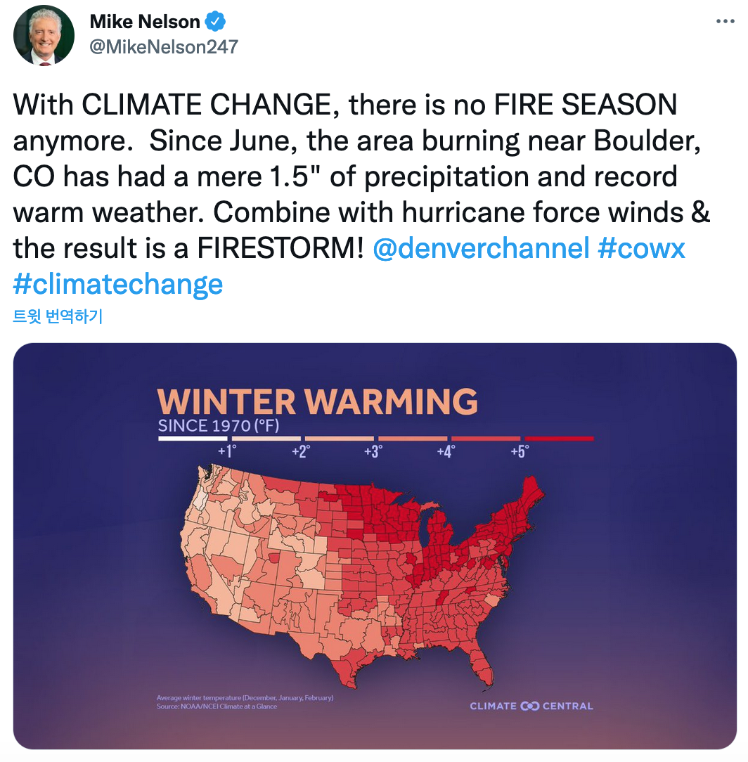 그 도시의 ABC 계열사인 Denver7의 수석 기상학자인 마이크 넬슨(Mike Nelson)은 트위터에 “기후 변화(CLIMATE CHANGE, 대문자로 강조 - 역자 주)로 더 이상 화재 시즌(FIRE SEASON)이 없습니다."라고 썼다.