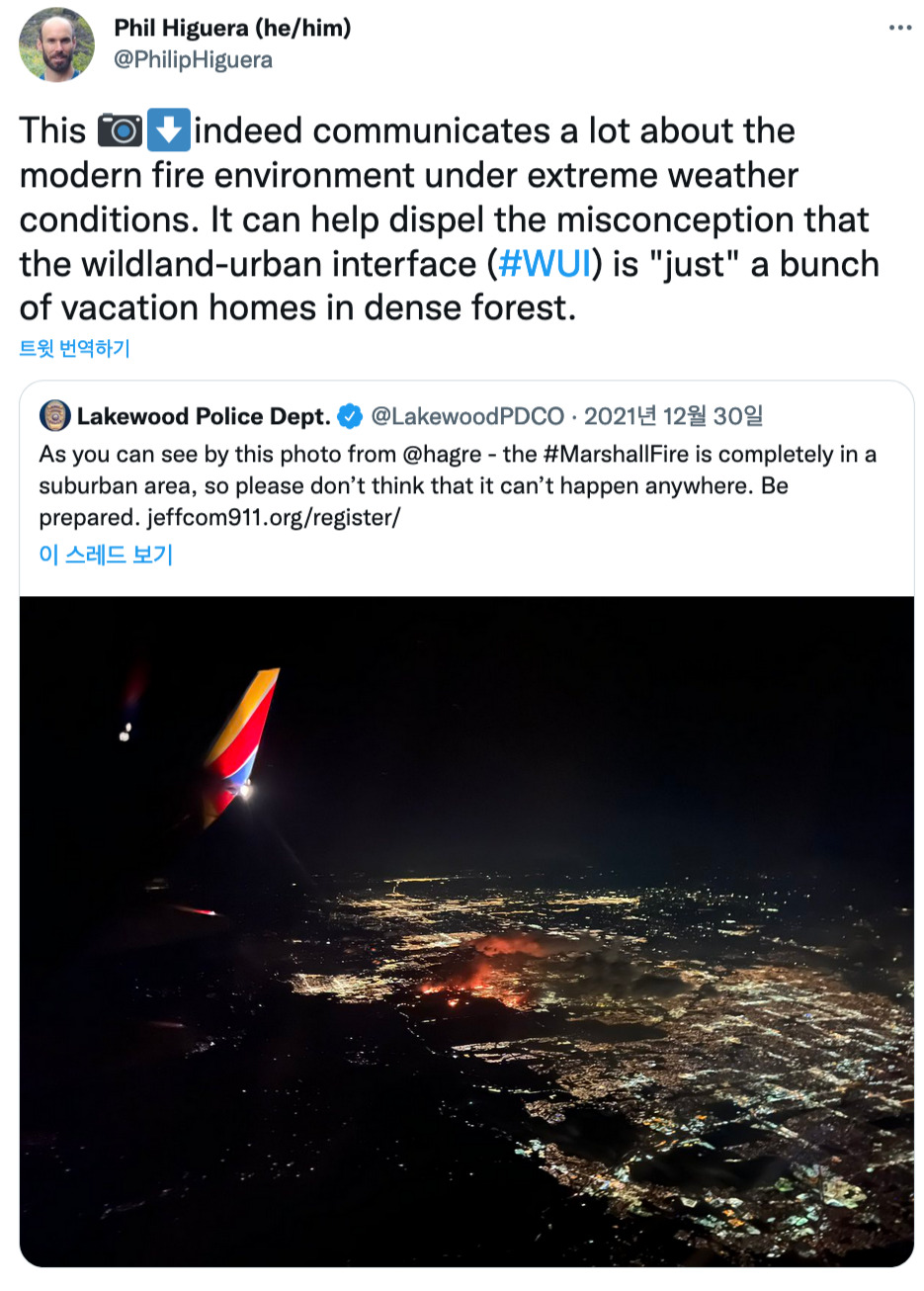 UCLA 기후과학자 대니얼 스웨인(Daniel Swain)은 트위터에 "다시 한번 배워야 할 교훈은 오늘날의 파괴적인 볼더 카운티의 여파로 콜로라도 화재가 교외까지 얼마나 멀리까지 갔는지... 인접지역이 충분히 극심한 가뭄과 바람 조건 속에서 실제로 확장된다는 것"이라고 말했다.