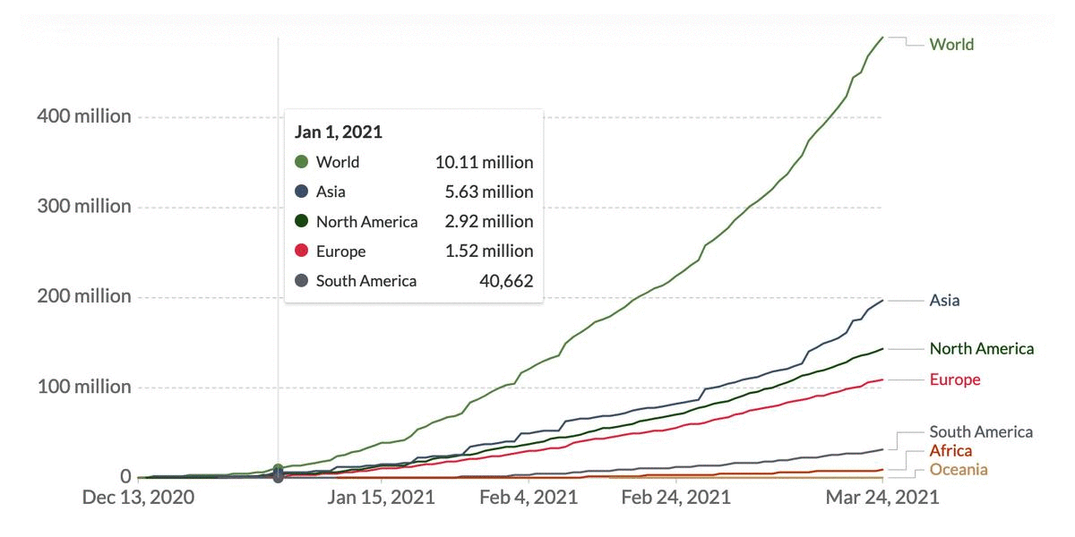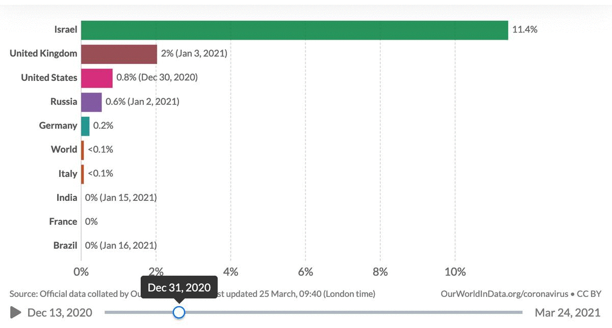 2021년 3월 24일 현재 전 세계 인구 중 약 3.4%가 1회 이상 백신 주사를 맞았다. 이스라엘이 전체 인구 중 약 60%가 백신 주사를 1회 이상 맞아 가장 빠른 속도로 접종이 진행되고 있다. 코로나 19 방역에서 정책적 오류로 많은 감염자와 사망자가 발생했던 영국과 미국은 백신 접종에서는 빠른 속도를 보이고 있다. 아래 그래프는 세계와 한국 등을 포함한 백신 접종률 추이다.