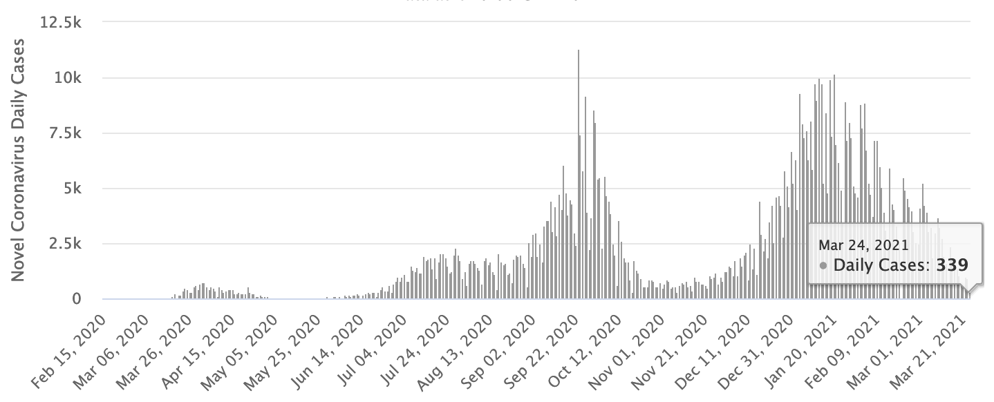 백신 접종 효과가 본격적으로 나타나는 1월 중순부터 일일 1만 건을 넘었던 감염자 수는 지속해서 하락해 현재 339명까지 떨어졌다. 60세 미만 인구 가운데 감염자는 급속하게, 그리고 60세 이상 인구 중 감염자 수도 완만하게 감소 중이다.