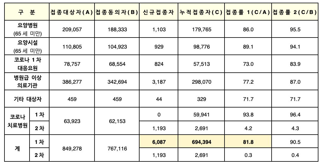 2월 26일부터 시작된 국내 접종은 중증 진행 위험, 의료와 방역체계 유지, 코로나 19 전파 특성의 기준에 따라 우선순위로 요양병원과 시설, 의료종사 등 고위험군 85만 명을 대상으로 진행됐다. 약 1달간에 걸친 접종에서 우선 접종대상자 전체의 약 82%, 그중 접종에 동의한 76만여 명의 90.5%가 1회 이상의 주사를 맞았다. 피 접종자 중 아스트라제네카 백신은 673,183명, 화이자 백신은 59,941명에게 투여되었다. 두 백신 모두 1차 접종만으로도 상당한 효과가 있는 것이 입증되었기에 고위험군의 경우만 놓고 보면 통상 집단면역이라 불리는 80% 면역 수준에 도달했고, 의료진 감염으로 인한 의료시스템의 붕괴는 막을 수 있게 됐다.