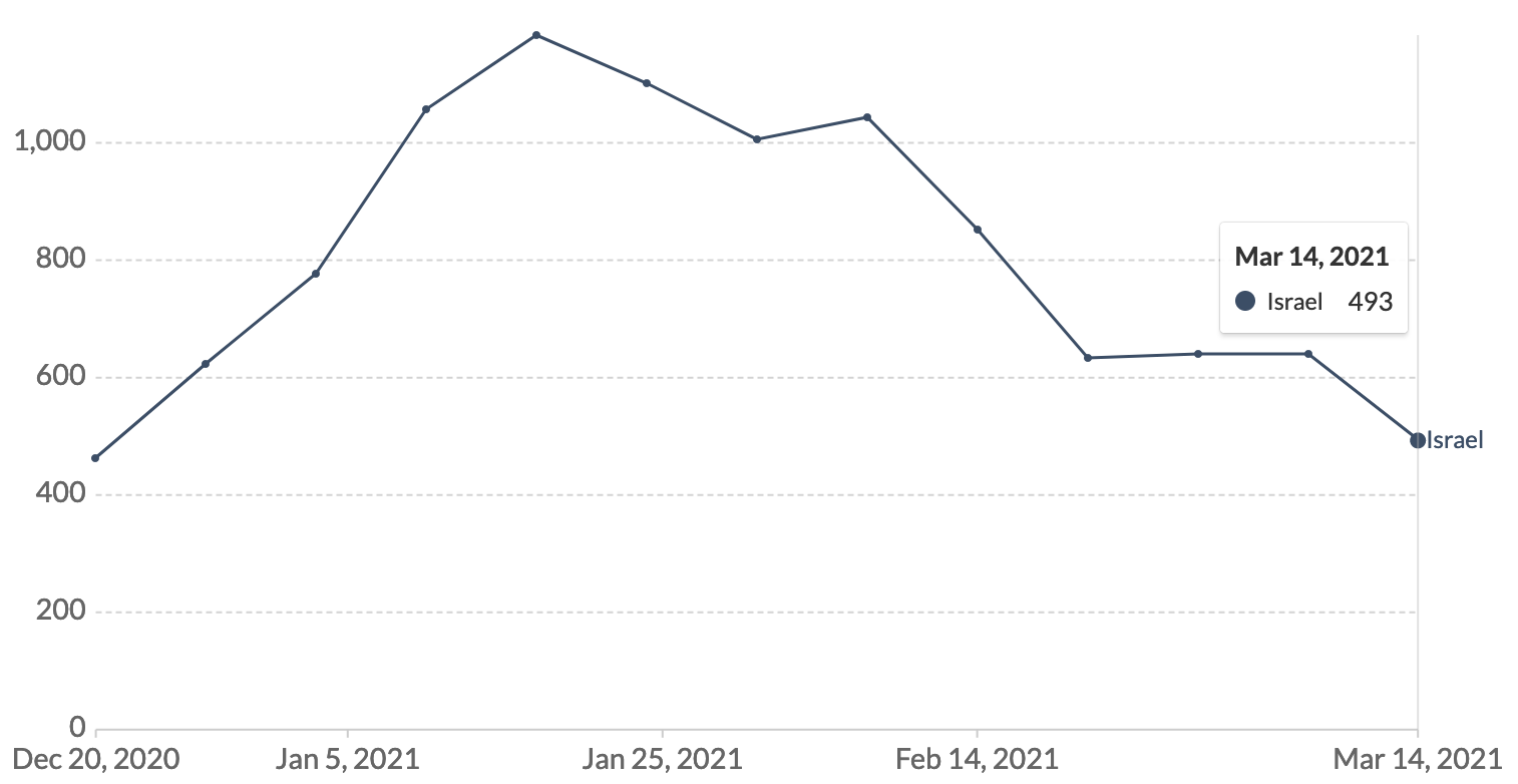 이스라엘 정부에 따르면 2주 전 확진율 3%, 1주 전 확진율 2%에서 2021년 3월 25일 현재 확진율은 1.3%로 2020년 6월 이래 최저다. 확진율은 1월 초 10%까지 올라갔었다. 현재 이스라엘의 감염재생산지수(R)는 0.55까지 떨어졌다. 이러한 상황의 호전에 따라 이스라엘 정부는 대부분의 교육 시스템과 경제를 재개했다. 최근에는 스포츠와 문화 행사장 제한적이나마 관객 입장이 허용되고 있다. 이스라엘 보건복지부는 다음 주 유대인들의 이집트 탈출을 기념하는 유월절(Passover) 집회에 실내 최대 20명, 실외 최대 50명까지 집회를 허용할 예정이라고 밝혔다.