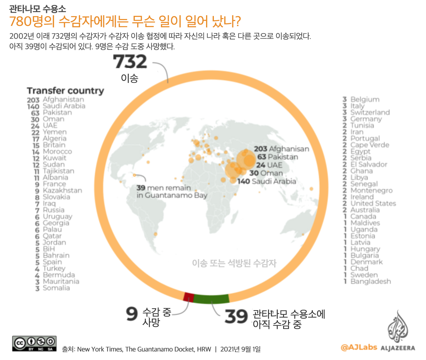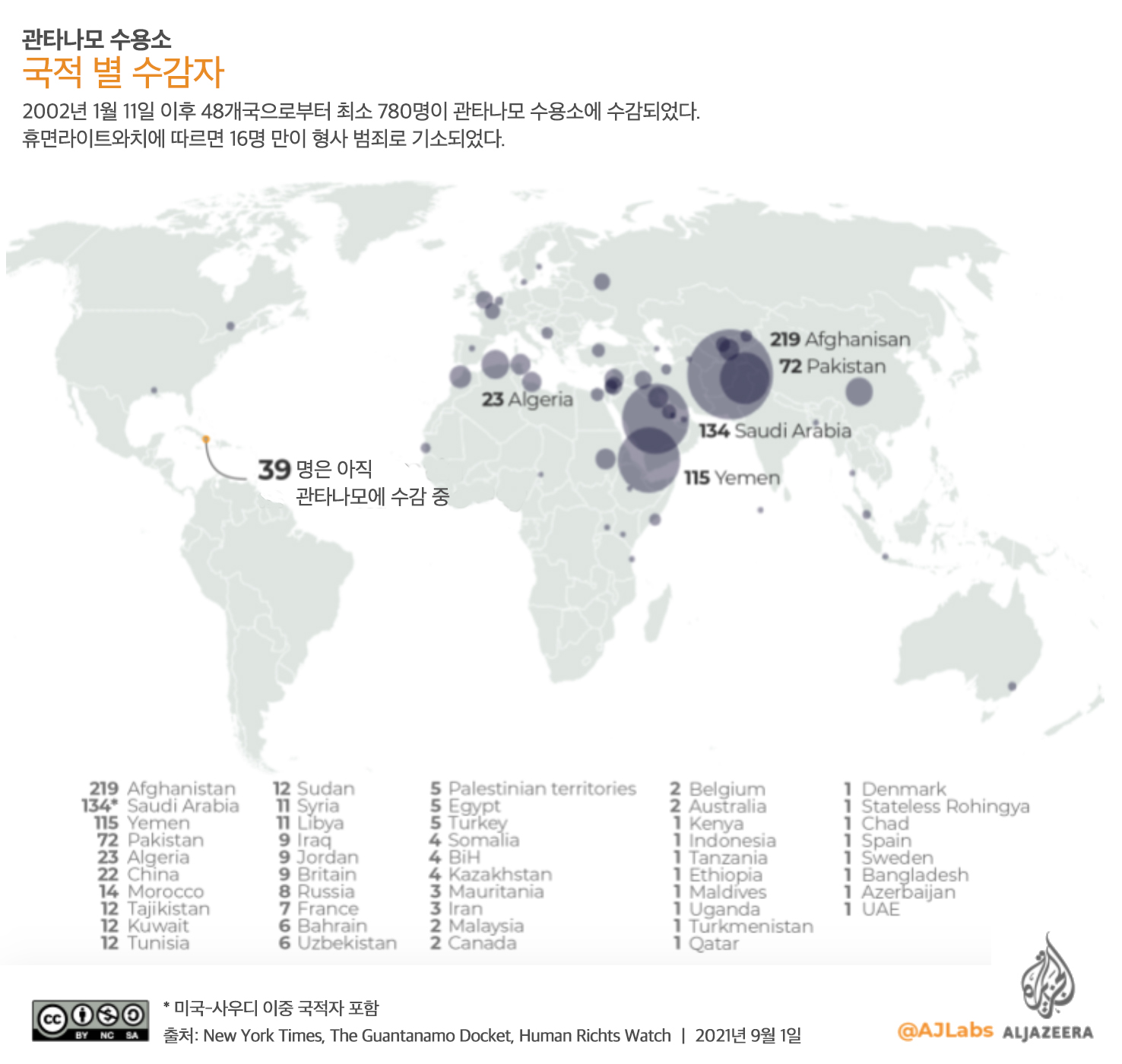 * 역자 주: 2001년 9.11 테러 후 미국의 부시 대통령은 테러와의 전쟁을 선언하며 쿠바의 관타나모 만에 테러범을 수감하기 위한 시설을 만든다. 지금으로부터 꼭 20년 전인 2002년 1월 11일 20명이 처음으로 관타나모만의 야외에 누구나 투명하게 안을 볼 수 있는 철망으로 된 우리의 캠프 엑스레이(Camp X-Ray)에 수감된다. 이 수용소에서는 물고문을 비롯한 다양한 고문이 행해졌으며, 수감자들은 이유 없는 구금에 대한 인신보호 영장인 헤비어스 코퍼스(habeas corpus)를 신청할 수 있는 근대의 가장 기본적인 권리가 박탈되었다. 심지어 수감자들의 실명은 AP 통신이 정보공개법을 통해 공개를 요청하기 전까지 공개되지 않았으며, AP에 자료가 공개되었을 때조차도 수감자들의 실명은 지워져 있었다. 미국은 이들에게 군사재판을 도입했고, 민간 법정에 설 수 있는 자격을 박탈했다. 대법원이 최종적으로 이들의 민간 소송을 인정하기 전까지 이들 수감자들에게는 인권과 법적 권리가 박탈되었다. 약 8백 명에 가까운 사람들이 이 시설을 거쳐갔지만 형사적 유죄를 받은 사람은 20명도 되지 않았으며 적지 않은 사람들은 아무런 이유 없이 혐의만으로 수년 동안 수감되어 비인간적인 대우를 받았다. 이러한 미국의 인권 탄압에 맞서 일부 수감자들은 단식 투쟁 등을 벌였고, 이로 인해 수감자들이 사망하기도 했다. 이 최악의 인권 탄압 시설을 폐쇄하겠다고 오바마와 바이이든 대통령은 공언했지만 폐쇄는 아직 이루어지지 않고 있다. 이 글은 Al Jazeera의 1월 10 자 기사 Timeline: 20 years of Guantanamo Bay prison의 번역으로 관타나모만 수용소의 건설부터 최근까지 20년의 잔혹한 타임라인을 기술하고 있다.
