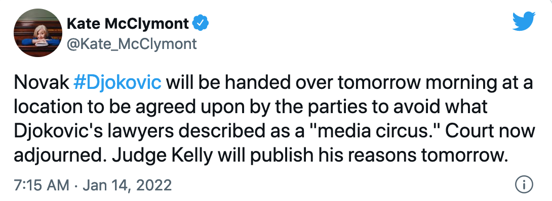 금요일 결정이 발표된 직후 긴급 심야 법원 심리에서 앤서니 켈리(Anthony Kelly) 판사는 항소 절차가 진행되는 동안 조코비치를 추방할 수 없다고 판결했다. 항소심은 일요일에 열릴 예정이다.