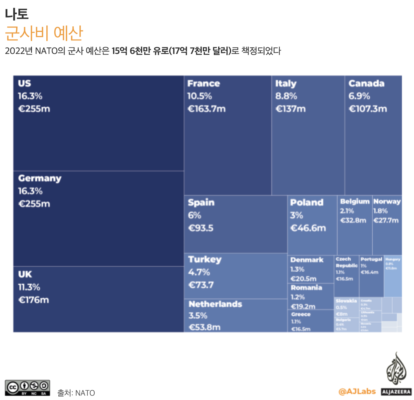 미국과 독일은 국방예산의 30% 이상을 차지하는 가장 높은 비율을 동등하게 기여한다.