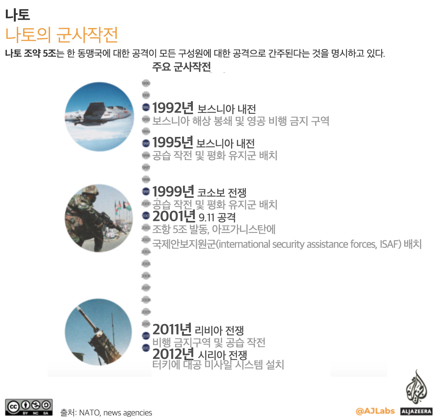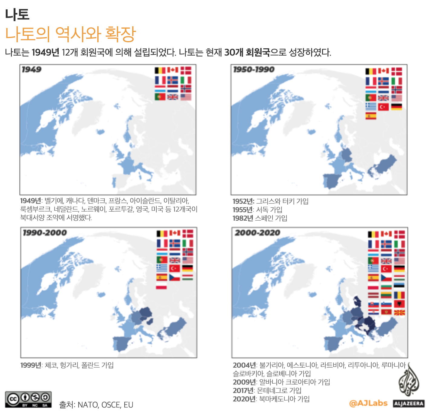 * 역자 주: 유럽과 미국 그리고 러시아와의 우크라이나를 둘러싼 긴장이 고조되고 있다. 미국과 서유럽은 냉전과 함께 1949년 북대서양 조약기구(NATO)를 창설하였고, 이에 대항하여 소련과 동유럽 국가들은 바르샤바 조약기구를 1955년 발족했다. 하지만 소련의 붕괴로 바르샤바 조약기구가 공중분해되고, 서유럽은 유럽연합의 확장, 유럽안보협력기구(OSCE)의 확대, 그리고 무엇보다도 정치 군사 동맹인 나토를 동쪽으로 끊임없이 전진시키고 있다. 이러한 나토의 확장은 최근에는 우크라이나까지 뻗치고 있으며, 자신의 앞마당까지 진출한 서방 세계의 NATO를 보며 러시아가 긴장하지 않느다면 오히려 이상한 것이다. 우크라이나를 둘러싼 서구의 러시아 간의 충돌은 이러한 기존의 긴장의 표현이다. 나토는 특히 냉전 이후 보스니아, 코소보, 심지어 아프가니스탄과 리비아에 이르기까지 유럽을 넘어서는 광범위한 군사작전을 벌이는 최대의 군사동맹이 되었다. 지금의 상황이라면 나토의 작전범위가 전 세계로 확장되지 않으리라는 보장은 없다. 특히 나토 조약 5조의 집단안보 조항은 나토의 군사작전을 전 세계로 확대할 수 있는 지렛대로 작용하고 있다. 이 글은 Al Jazeera의 1월 12일 자 기사 Infographic: NATO’s members, mission and tensions with Russia의 번역으로 나토의 탄생, 확장, 군사작전과 군비 등을 그래프를 통해 알기 쉽게 설명하고 있다.