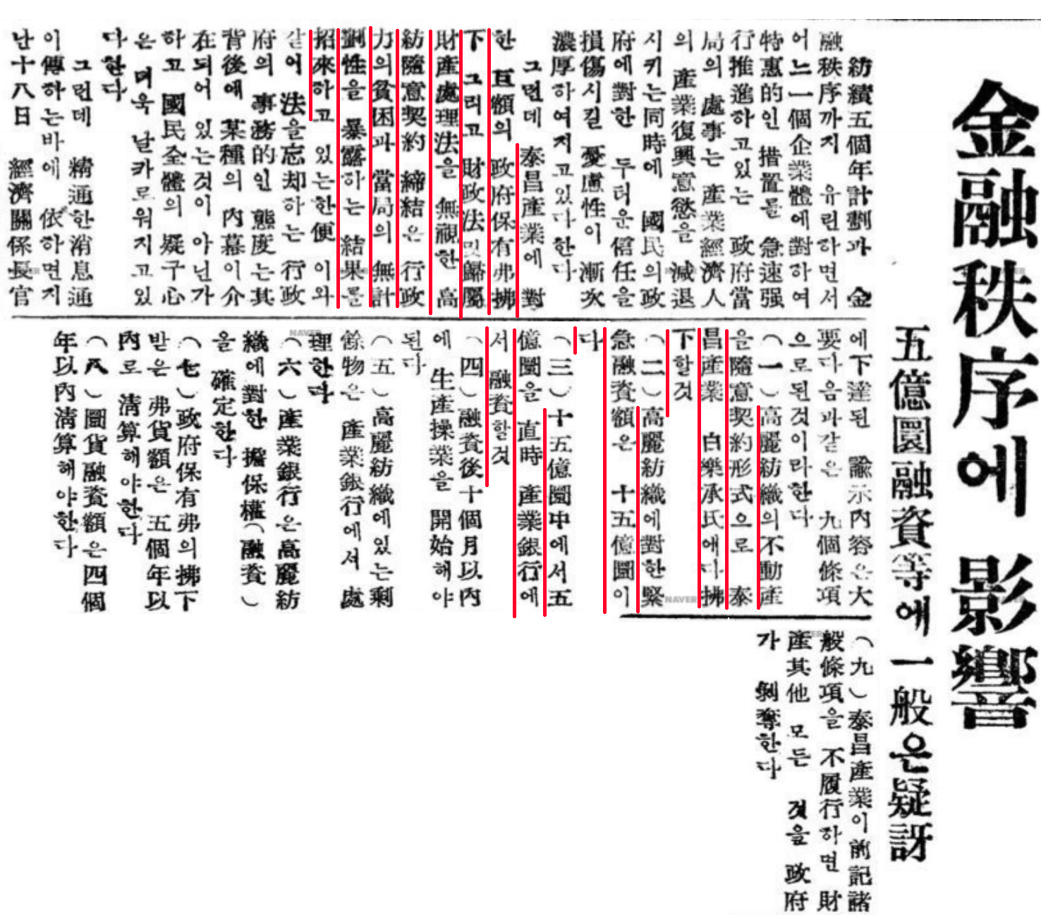 귀속재산과 원조물자의 특혜적 배분 외에도 기업은 은행의 특혜적인 저금리 대출로 자본을 축적했다. 이 특혜적인 대출금리는 물가 상승률보다 낮아서 대출 자체만으로 이득이 있었다. 이 특혜저금리는 일부 기업에 집중되었다. 1957년 하반기 은행 대출액의 1/3이 전체 대출의 0.3%에 해당하는 1억 환 이상의 융자에 집중됐다.