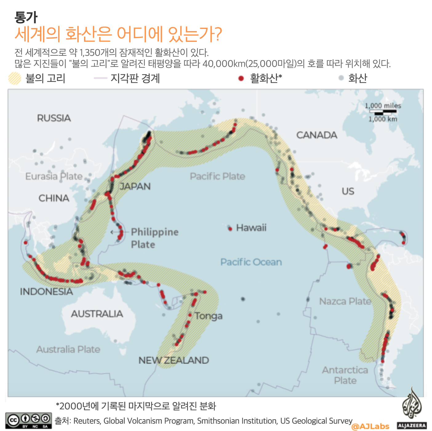 * 통가 화산의 분화는 12월 20일부터 감지되었지만 1월 11일 휴면 상태로 선언되었었다. 그렇기 때문에 1월 15일 통가 화산의 폭발은 충격적이었다. 그 거대한 폭발은 2천 킬로미터 떨어진 곳에서도 화산 폭발음을 들을 수 있을 정도로 엄청났으며, 위성사진을 통해 그 폭발의 위력을 고스란히 드러냈다. 이 화산 폭발로 인한 쓰나미로 호주 동부 해안, 하와이, 알래스카 및 미국 태평양 연안에 쓰나미 주의보가 발령되었다. 이 화산의 거대한 분화 이후 통가와의 모든 인터넷 연결은 끊어졌고, 섬의 표면적이 화산재에 의해 거의 45% 확장되었다고 한다. 이 폭발의 폭력성과 격렬성은 한편으로는 마그마가 빠른 속도로 분출하면서 물과 직접 접촉하면서 생긴 연료-냉각제 상호작용(fuel-coolant interaction)에 의해 설명될 수 있으며, 다른 한편으로는 기존 화산 활동의 누적의 결과로써 설명될 수 있다. 지난 30여 년 동안 가장 큰 화산 폭발이 통가 화산 분화로 인한 피해는 아직 분명하지 않다. 1백 여개의 섬으로 구성된 통가는 두꺼운 화산재로 뒤덮였으며 수중케이블 손상으로 통신이 완전히 차단되어 피해상황을 파악하기 어렵기 때문이다. 국제적십자사연맹은 쓰나미 파도로 해안지역에 대규모 피해가 있으며, 섬들의 저지대에 우려할만한 피해가 있지만 정확한 피해규모는 아직 알 수 없다고 밝혔다. 현재 가장 심각한 것은 물 부족이며 구호단체들은 하루 25만 리터의 물을 공급 중이라고 밝혔다. 현재까지 2명이 사망하고 최소 100채 이상의 가옥이 손상된 것으로 파악되지만 화산재가 가라앉고 통신이 복구되어야 대략의 피해상황을 파악할 수 있다. 이 글은 Al Jazeera의 Mohammed Haddad의 1월 17일 자 기사 Tonga’s volcano eruption and tsunami explained in maps and charts의 번역으로 통가에 대한 소개, 통가 훙가 통가–헝가 하파이 화산 폭발의 규모, 세계 화산 지대, 해저 화산 폭발 과정, 쓰나미 경보를 지도와 차트로 알기 쉽게 요약하고 있다.