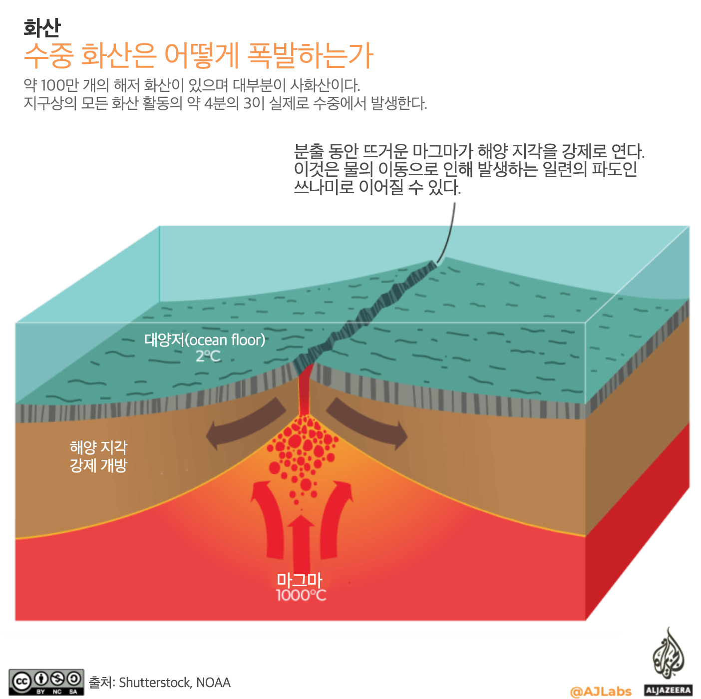 분출 동안 뜨거운 마그마가 해양 지각을 강제로 연다. 이것은 물의 이동으로 인해 발생하는 일련의 파도인 쓰나미로 이어질 수 있다.