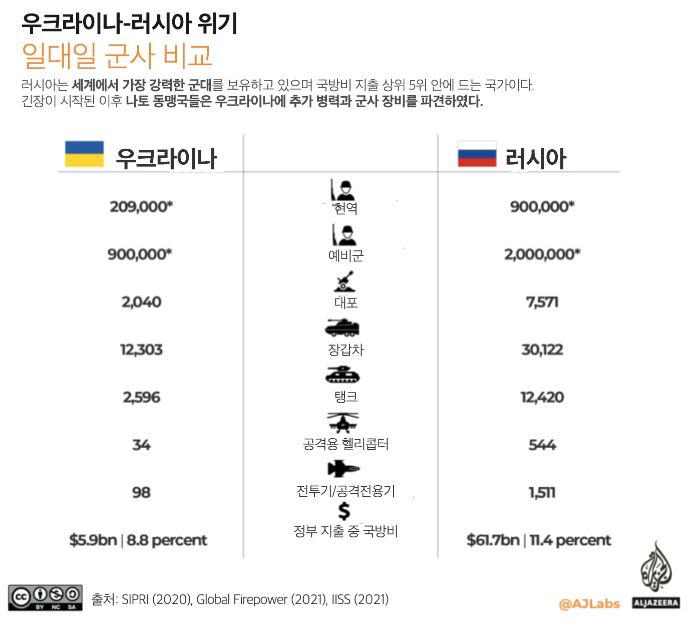 | 우크라이나 vs 러시아 군사력 비교와 세계 순위: 인력, 재정, 공군, 육군, 해군, 군수, 자원 (0) | 2022.01.24 |