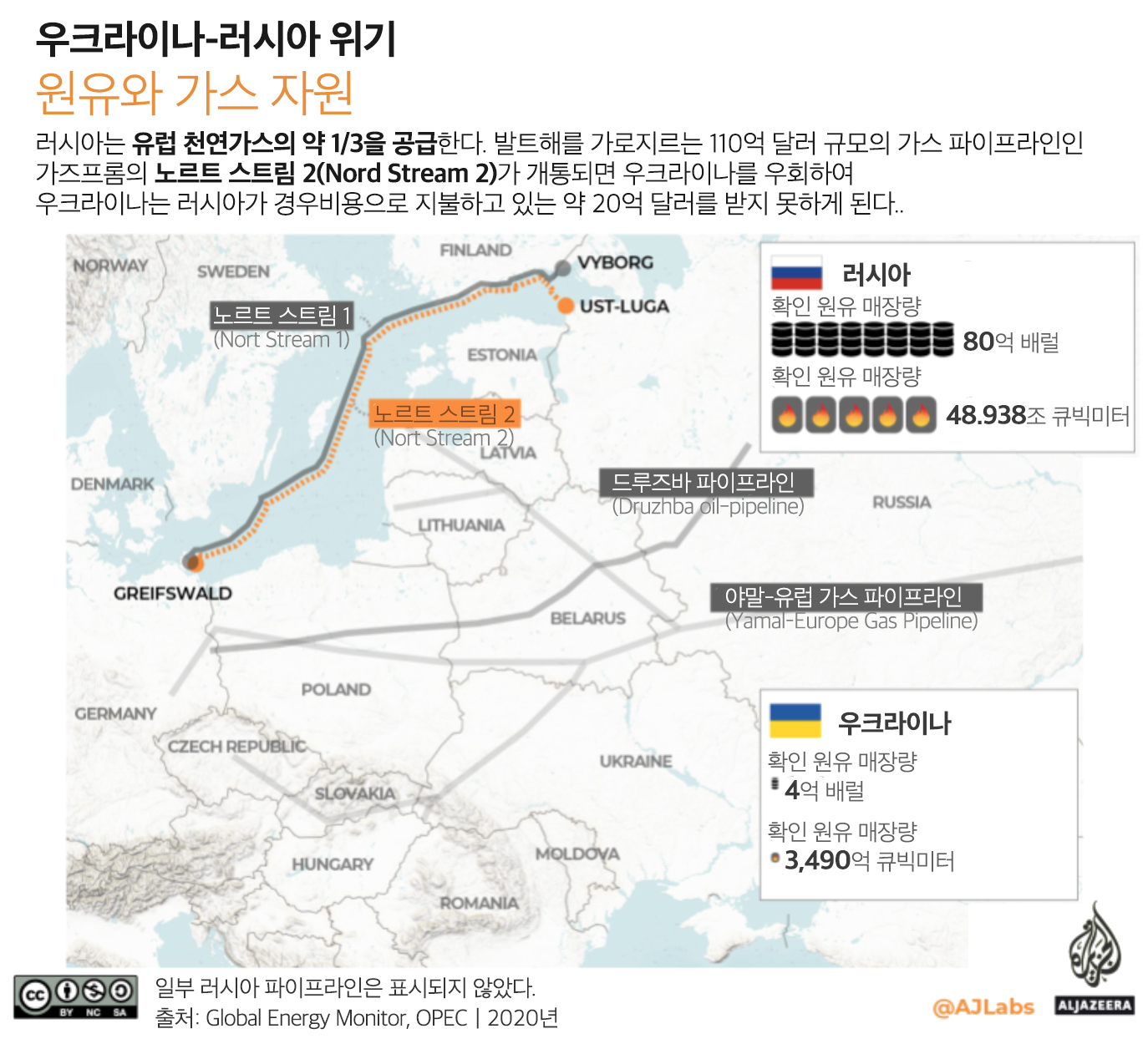 역자 주: 서구와 러시아 간의 외교적 노력과 자원이 소진되면서 군사적 충돌의 가능성이 점차 높아지고 있다. 바이든은 러시아가 우크라이나를 침공할 위험이 있다고 경고하고 있으며 반대로 푸틴은 미국이 러시아를 전쟁으로 끌어들이려 한다고 비난하고 있다. 러시아가 우크라이나 접경 지역에 병력을 집중시키는 다른 한편에서 미국과 서유럽 국가들은 우크라이나에 대한 무기와 병력을 지원함으로써 러시아-우크라이나 국경지대의 긴장이 고조되고 있다. 푸틴은 독일 통일을 허용하는 대신 서유럽이 러시아를 향해 동진하지 않겠다는 약속을 어기고 우크라이나를 나토에 가입시키려 한다며 비난하며 서구에 우크라이나의 나토 가입 반대 보장을 요구하고 있다. 하지만 미국을 포함한 나토는 그러한 약속은 존재하지 않았다며 우크라이나 나토 가입 반대 보장을 거부하고 있다. 만약 이대로 긴장이 점점 고조된다면 양측의 군사적 충돌은 불가피해질 수 있다. 그 경우 러시아가 압도적 군사력으로 우크라이나를 압도할 가능성이 높지만 서구의 지원을 등에 업은 우크라이나 또한 쉽게 투항하지 않을 것이다. 이 글은 Al Jazeera의 1월 28일 자 기사 Ukraine and Russia explained in maps and charts로 우크라이나-러시아 위기의 배경이 되는 역사, 정치, 경제적 요인들을 지도와 차트로 알기 쉽게 설명하고 있다.