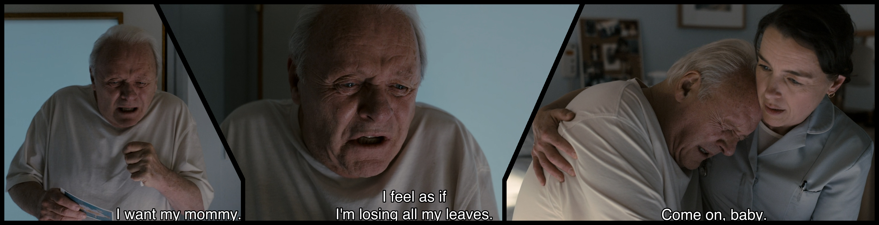 영화 《더 파더》의 아버지라는 명사는 가족의 일부를 지시하지 않는다. 살아 있는 딸은 그에게 등을 돌리고, 사랑하는 딸은 그의 곁을 떠난 지 오래다. 그는 앤서니라는 이름으로 불릴 뿐, '아버지'는 공허한 명사일 뿐이다. 그는 지켜야 할 가정도, 세워야 할 권위도, 거느리고 있는 자식도 없다. '아버지'는 공허한 자리가 되었다. 그 공허뿐인 자리를 지키던 앤서니도 마지막에는 엄마를 찾는다. 이 순간 우리는 'The Father'가 가족을 지시하고, 가족과 관련을 맺는 '아버지'가 아니라 낡은 질서의 상징이 아닌가 의심하게 된다.