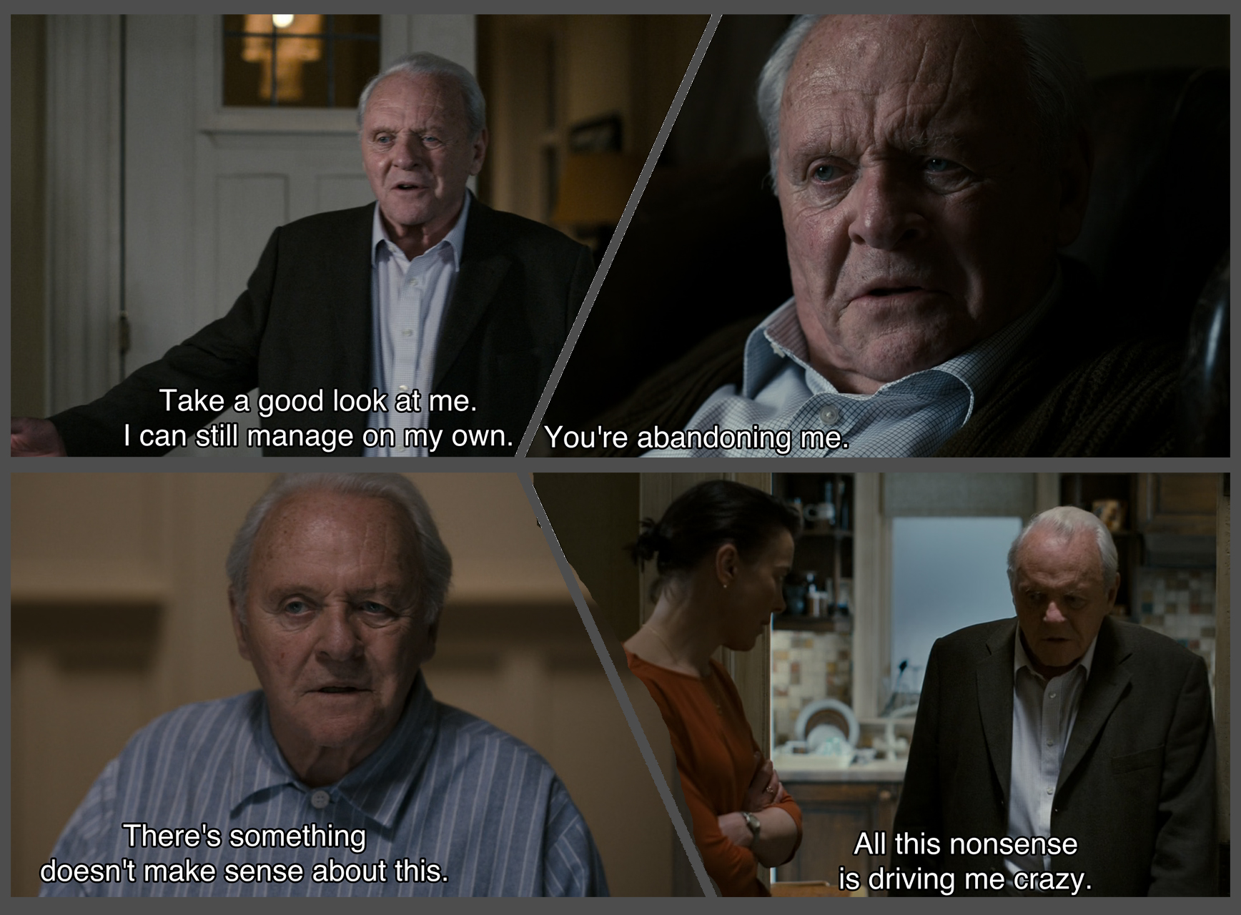 자신이 위치한 시공간은 왜곡되고, 그 속에서 발생하는 사건의 인과는 엉망이 되는 상황에서 독립된 주체, 단일한 주체, 이성적 주체는 더는 존재할 수 없다. 80이 넘었지만, 탭댄스 정도는 쉽게 출 수 있을 정도로 강인한 육체를 지닌 앤서니는 모든 것을 혼자 감당(manage)할 수 있다고 큰소리친다. 하지만 딸이 파리로 떠난다고 하자 그 강인한 주체는 이내 독립성을 상실하고, "나를 버린다는 말이냐?"며 좌절한다. 그는 더는 세상을 합리적으로 이해(sense)할 수 있는 이성적 주체가 아니다. 보통 영화 캐릭터들의 변화와 모순에는 캐릭터의 모티브가 존재하며, 이 캐릭터 모티브는 그 모순과 변화를 설명하는 가교다. 예컨대 어린 시절 부모의 학대, 과거 연인의 상실, 혹은 이성애 사회의 동성애와 같은 동기는 한 캐릭터의 강인함과 나약함, 외향성과 내향성, 침착성과 다혈질 이란 충돌하고, 모순되는 성격과 행동을 관객들에게 이해시키는 연결고리다. 하지만 강인한 주연과 나약한 조연, 우울한 주연과 활기찬 조연, 이성적 주연과 감정적 조연의 자리를 수시로 바꾸는 앤서니에게는 동기가 없다. 그 모순과 충돌의 대립을 하나로 엮는 자아가 분열되었기 때문이다. 그의 치매는 모순된 자신을 연결하고 설명하는 캐릭터 동기를 창밖으로, 그의 자아 밖으로 던져 버렸다. 그는 더이상 이성적 주체가 아니다.