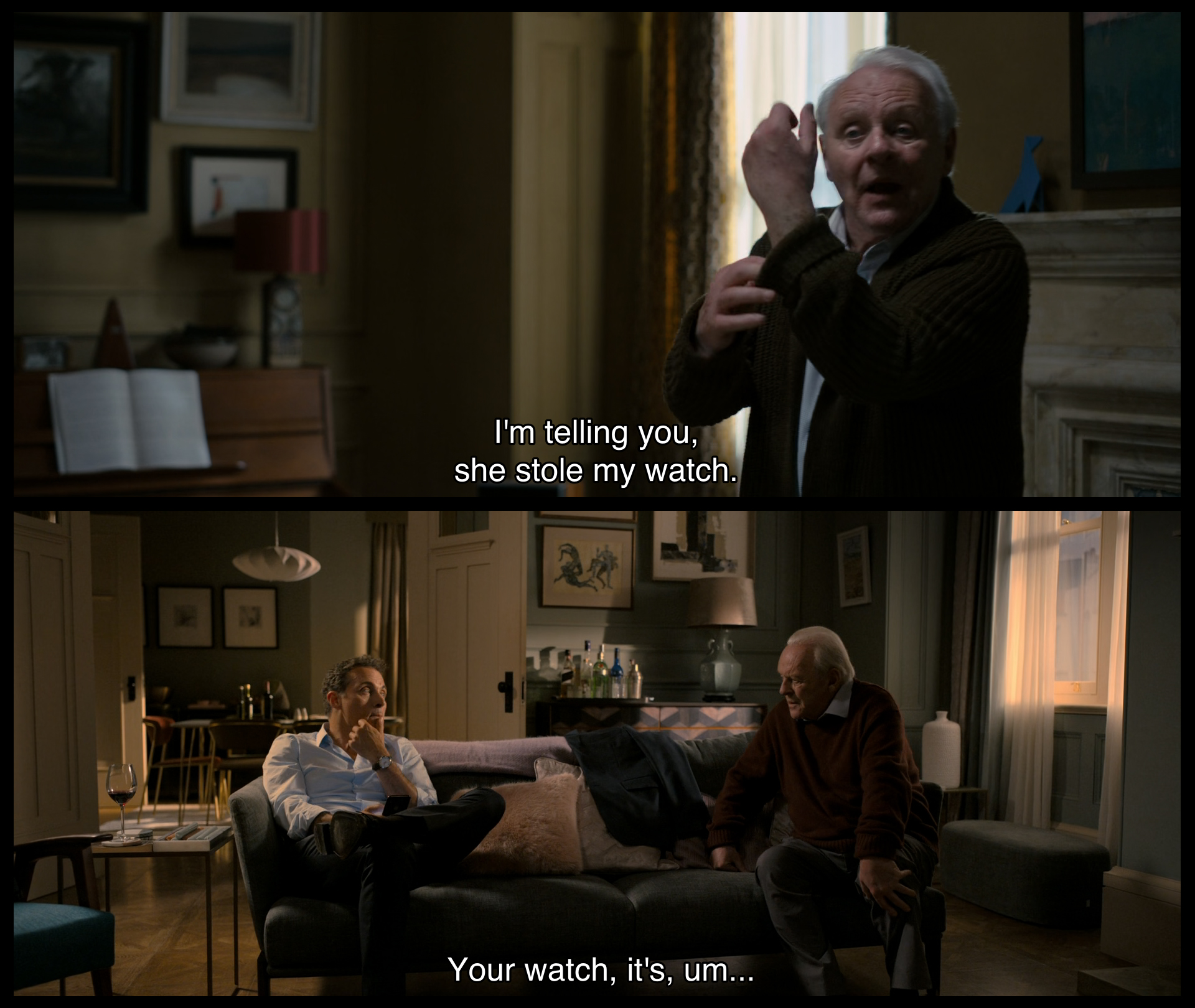주인공 앤서니에게 시계는 곧 자기 자신이다. 시계는 시간을 의미하며, 시간은 역사다. 그에게 시계는 개인의 역사며, 시계를 상실하는 순간 자기 자신을 잃는다. 그래서 자신을 돌보는 사람이 시계를 훔쳐 가지 않았을까, 자신의 사위가 찬 시계가 자신의 것이 아닐까 늘 의심하며 시계에 집착한다. 시계의 상실은 자신의 역사를 상실하는 것이다. 그 역사는 수많은 기억으로 구성되지만, 시계를 어디에 두었는지 망각한 앤서니는 결국 자기 정체성을 구성하는 핵심으로서 기억을 상실한 것이다. 영화의 마지막, 자아를 잃어 버리고 세상이 어떻게 돌아가는지 이해할 수 없게 된 절망의 그 순간에도 앤서니는 빈 손목을 가리키며 "나는 내 시계가 내 손목에 있다는 것을 안다, 그 여정에서"라고 말한다. 시계의 상실은 시간, 인생의 여정, 그 모든 것이 사라지는 것을 의미한다.