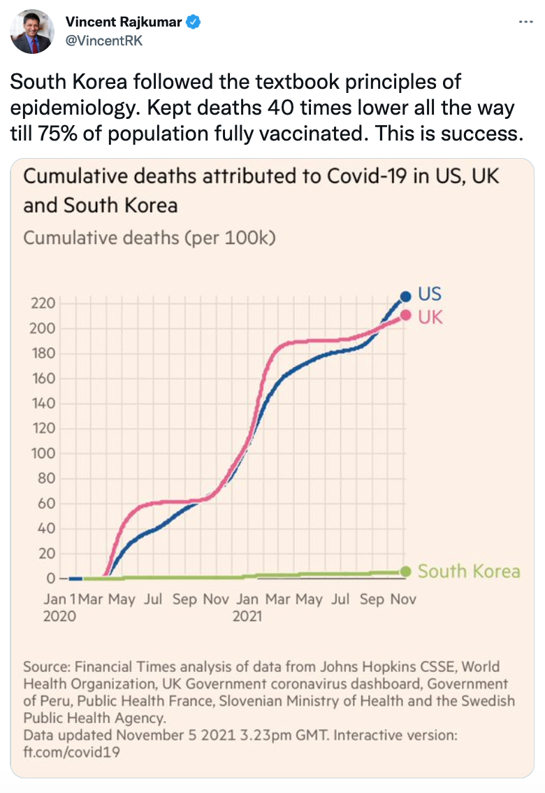 의사 빈센트 라즈쿠마(Vincent Rajkumar)는 차트에 대한 응답으로 트위터에서 "한국은 인구의 75%가 완전히 예방 접종을 받을 때까지 사망자 수를 40배나 낮췄습니다."라고 말했다. "이것은 성공입니다."