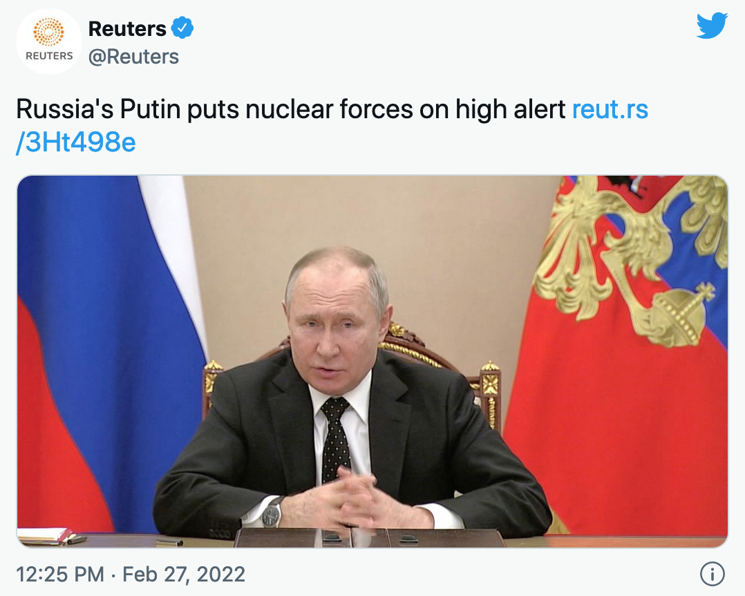 블라디미르 푸틴 러시아 대통령은 밤새 국방장관과 군 수뇌부에 핵 억지력을 '특별 전투 의무 체제'로 배치할 것을 지시했다