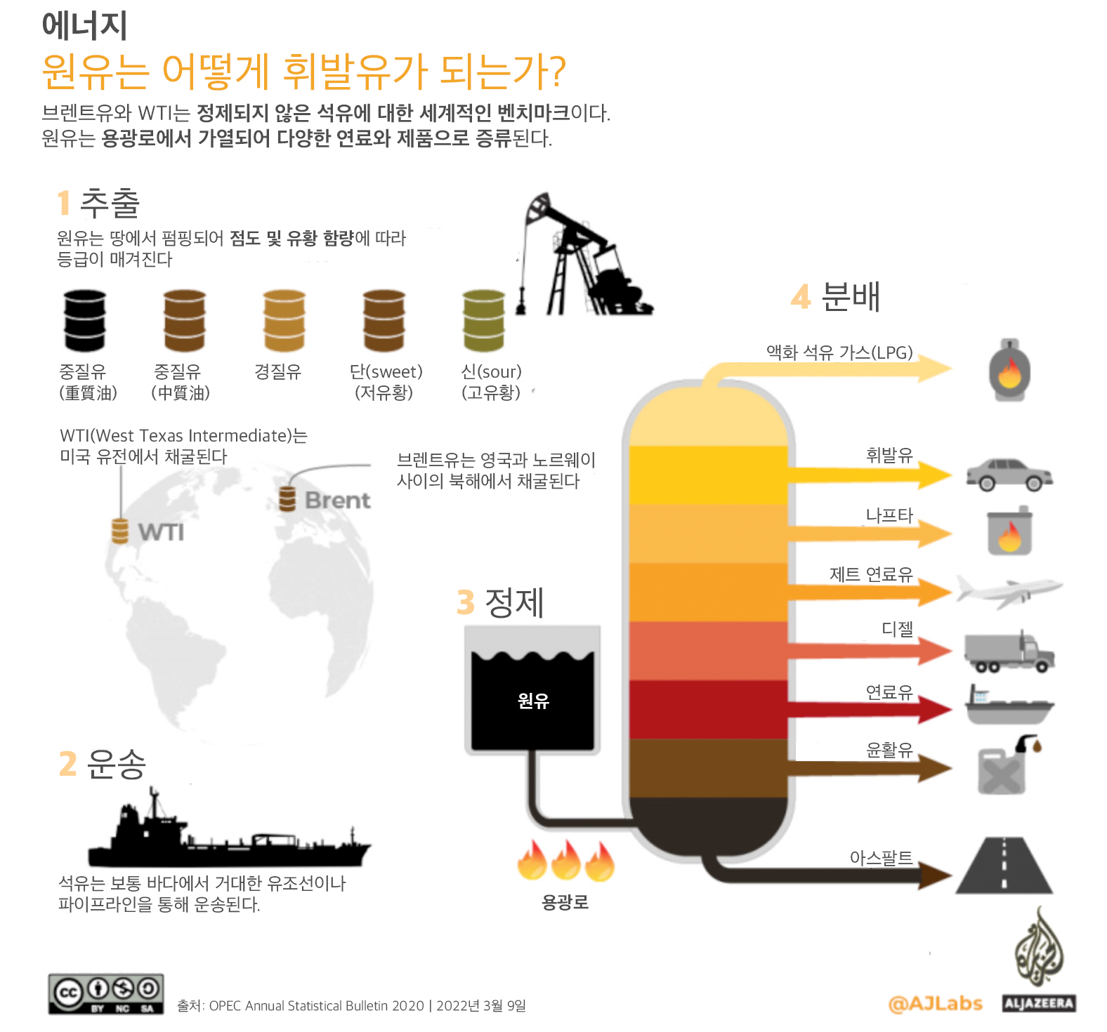 * 역자 주: 러시아의 우크라이나 침공 이후 원유가가 2008년 이후 최고가로 치솟았다. 러시아는 사우디 아라비아 다음으로 세계 2번째 원유 수출국이다. 현재 48개 국이 러시아로부터 원유를 수입하고 있다. 한국의 러시아로부터 에너지원 수입은 전체 원유 중 5.6%, 액화천연가스(LNG) 중 6.2%로 약 12%에 달한다. 한국은 러시아 수입량을 다른 산유국으로부터의 수입으로 대체할 수 없기 때문에 에너지 제재 국제공조가 어려운 형편이다. 이 글은 Al Jazeera 3월 10일 자 기사 Infographic: How much of your country’s oil comes from Russia? 의 번역으로 전 세계 석유 매장량과 생산 순위, 주요 석유 수출국, 원유의 생산과 사용 과정, 러시아 원유 의존국 등을 그래프와 지도를 통해 보여주고 있다.