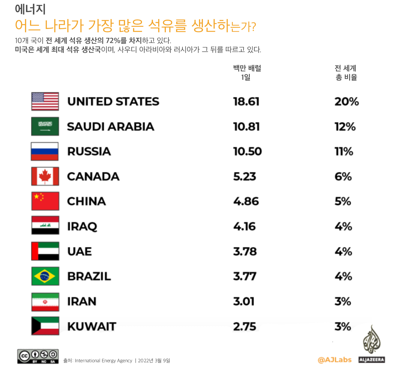* 역자 주: 러시아의 우크라이나 침공 이후 원유가가 2008년 이후 최고가로 치솟았다. 러시아는 사우디 아라비아 다음으로 세계 2번째 원유 수출국이다. 현재 48개 국이 러시아로부터 원유를 수입하고 있다. 한국의 러시아로부터 에너지원 수입은 전체 원유 중 5.6%, 액화천연가스(LNG) 중 6.2%로 약 12%에 달한다. 한국은 러시아 수입량을 다른 산유국으로부터의 수입으로 대체할 수 없기 때문에 에너지 제재 국제공조가 어려운 형편이다. 이 글은 Al Jazeera 3월 10일 자 기사 Infographic: How much of your country’s oil comes from Russia? 의 번역으로 전 세계 석유 매장량과 생산 순위, 주요 석유 수출국, 원유의 생산과 사용 과정, 러시아 원유 의존국 등을 그래프와 지도를 통해 보여주고 있다.