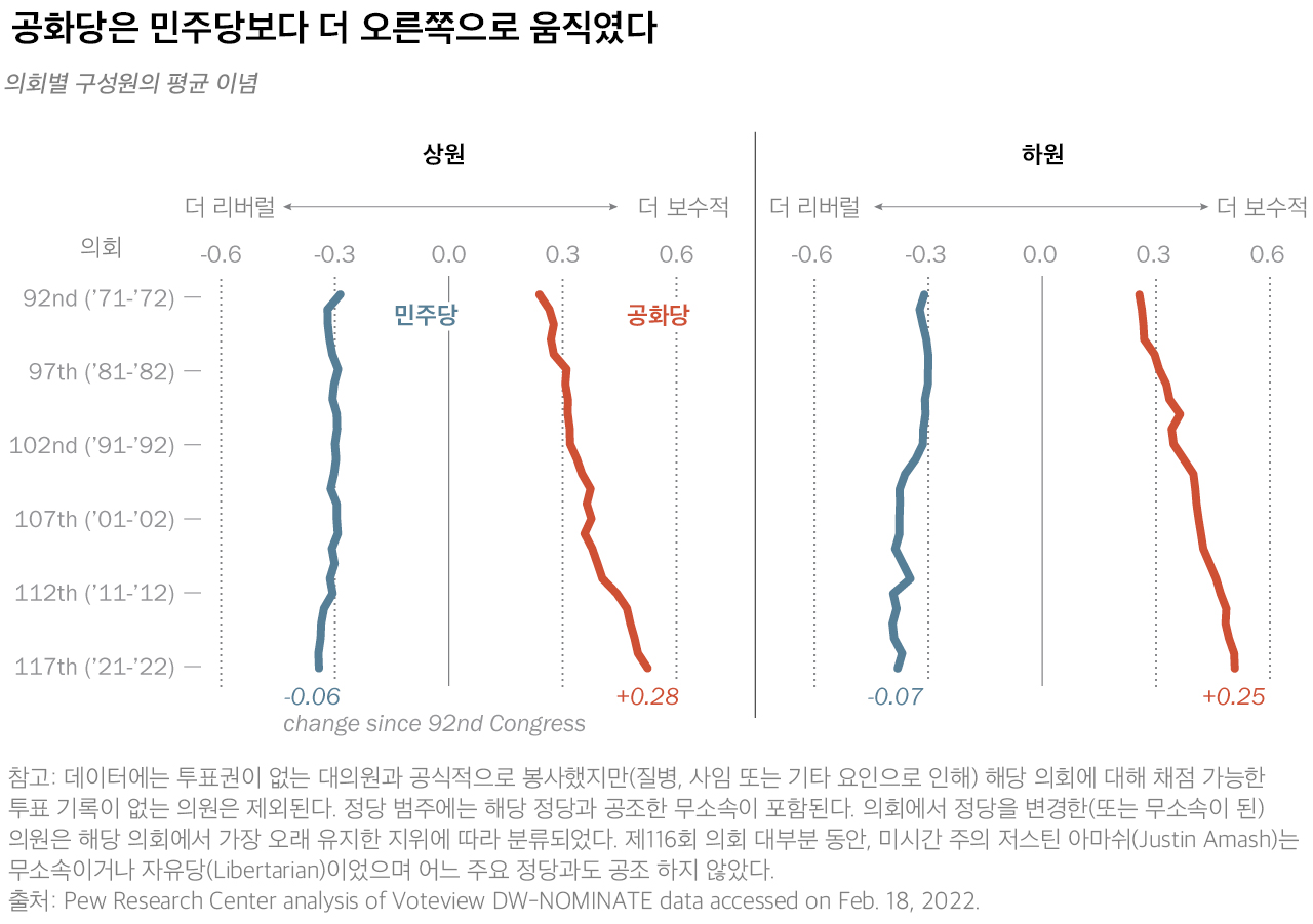 * 역자 주: 미국 민주/공화 양당 정치의 양극화는 트럼프 당선과 재선 실패로 또렷하게 드러났지만, 그 현상의 기원은 훨씬 오래되었다. 이미 1970년대 초반부터 본격화된 정당 양극화는 1980년대 이후 가속화된 신자유주의와 함께 심화되었다. 그리고 그 경향은 민주당의 좌경화보다 공화당의 더 심각한 우경화를 특징으로 한다. 이러한 양극화는 정치적 중간지대를 소멸시켰으며 논쟁적인 주제에 대한 초당파적 합의를 점점 더 어렵게 만들고 있다. 이 글은 Pew Research Center의 수석 작가이자 편집자인 Drew DeSilver의 3월 10일 자 Pew Research Center 기고 글 The polarization in today’s Congress has roots that go back decades의 번역으로 지난 50년 간 미국 상하원의 정부와 경제 정책에 대한 의원들의 투표성향에 따른 이념 변화를 추적하고 있다. 이 글에 따르면 지난 50년 동안 민주당과 공화당은 각각 왼쪽과 오른쪽으로 이동했으며 공화당의 우경화가 더 급속했다. 또한 이러한 이념적 변화에 따라 정치적 중간이 사라지고 정당의 양극화가 더 첨예화됐다. 참고로 Pew Research Center는 워싱턴에 소재를 두고 있으며 여론조사와 팩트에 기반한 연구로 유명한 싱크 탱크로 이 센터의 여론 조사는 갤럽에 못지않은 권위를 가지고 있다. Pew Research Center는 스스로를 싱크 탱크보다는 팩트 탱크(fact tank)로 지칭하며 미국과 세계 각국의 여론과 문제의식, 경향에 대해 조사한다.