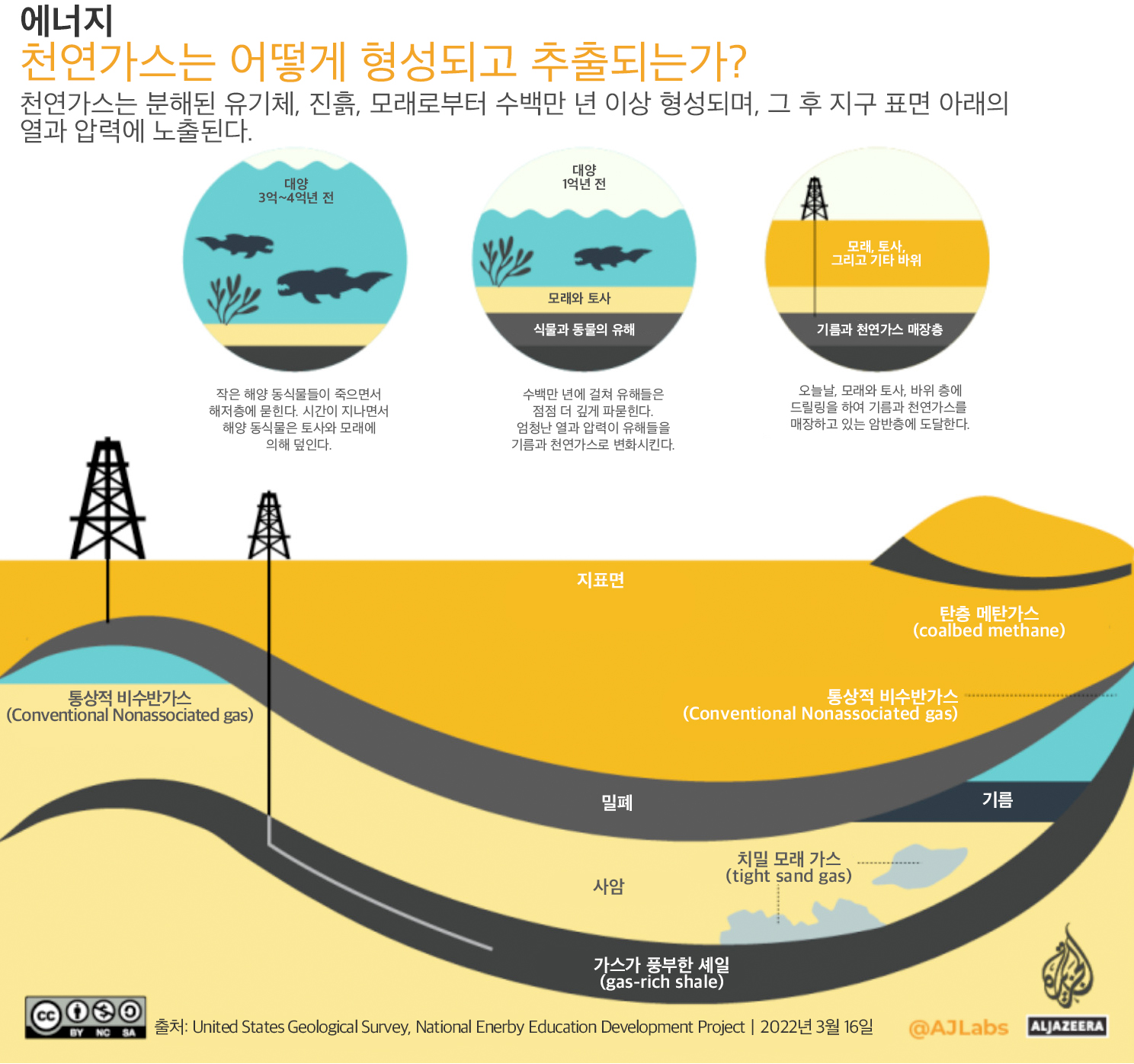 무취와 무색의 천연가스는 분해된 유기체, 진흙, 모래로부터 수백만 년 이상 형성되며, 그 후 지구 표면 아래의 열과 압력에 노출된다.