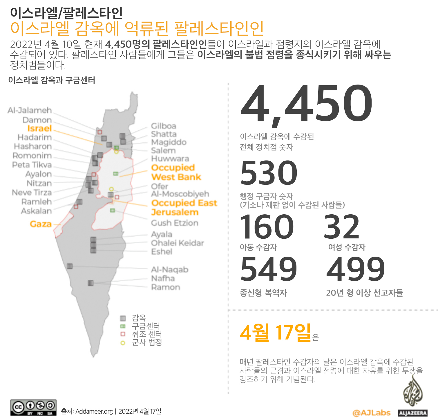 * 역자 주: 1974년 팔레스타인 민족회의(Palestinian National Council)가 4월 17일을 '팔레스타인 수감자의 날'(Palestinian Prisoner’s Day)로 지정한 이후 세계의 인권단체들이 이 날을 기념하고 있다. 현재 이스라엘은 자신의 영토와 점령지에 구금시설을 두고 약 약 4,450명의 팔레스타인인들을 구금하고 있다. 국제법 상으로 점령국은 점령지 외부로 수감자들을 이송하거나 억류할 수 없지만, 이스라엘은 이런 국제법을 서슴지 않고 위반하고 있다. 이스라엘은 또한 어린이를 군사법정에 세우는 지상의 유일한 국가로 약 160명의 어린이가 감옥에 갇혀있다. 수감자들 중 약 530명은 사법절차 없이 행정부의 명령에 의해 어떠한 증거의 열람도 금지된 채 구금되어 있으며, 이 구금은 최대 6개월이지만 수감자가 죽을 때까지도 얼마든지 연장 가능하다. 이 글은 Al Jazeera 4월 17일 자 기사 Infographic: How many Palestinians are imprisoned by Israel? 의 번역으로 이스라엘에 의해 구금된 팔레스타인인들의 세부 구성, 어린이 구금과 행정 구금 상태를 인포그래픽을 통해 설명하고 있다.