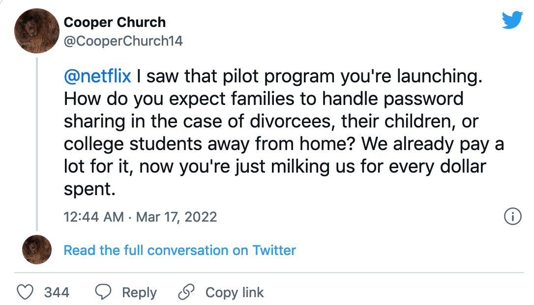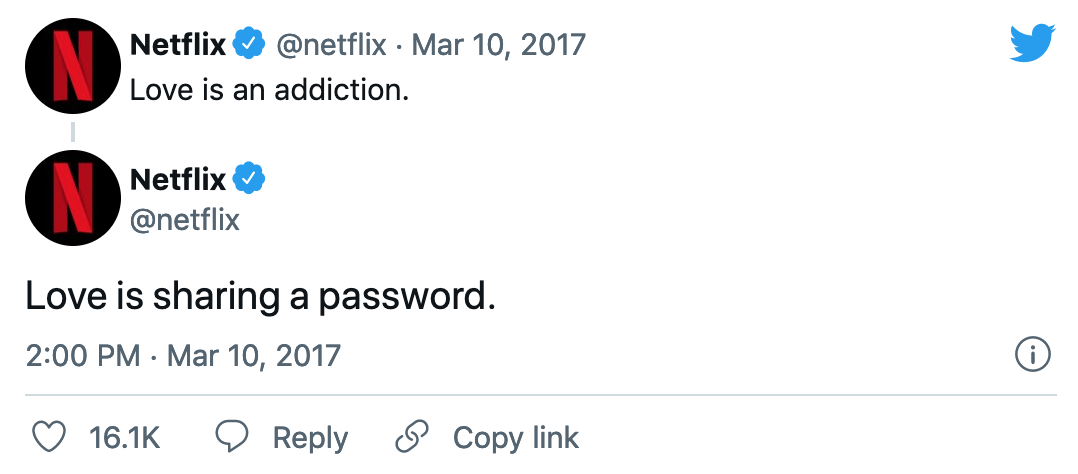 수년 동안 넷플릭스 및 기타 스트리머는 암호 공유에 대해 신경 쓰지 않았고 심지어 그것을 묵인하는 것처럼 보였다. 2017년에 이 회사는 "사랑은 하나의 암호를 공유하는 것입니다"(love is sharing a password)라는 트윗으로 유명했다.