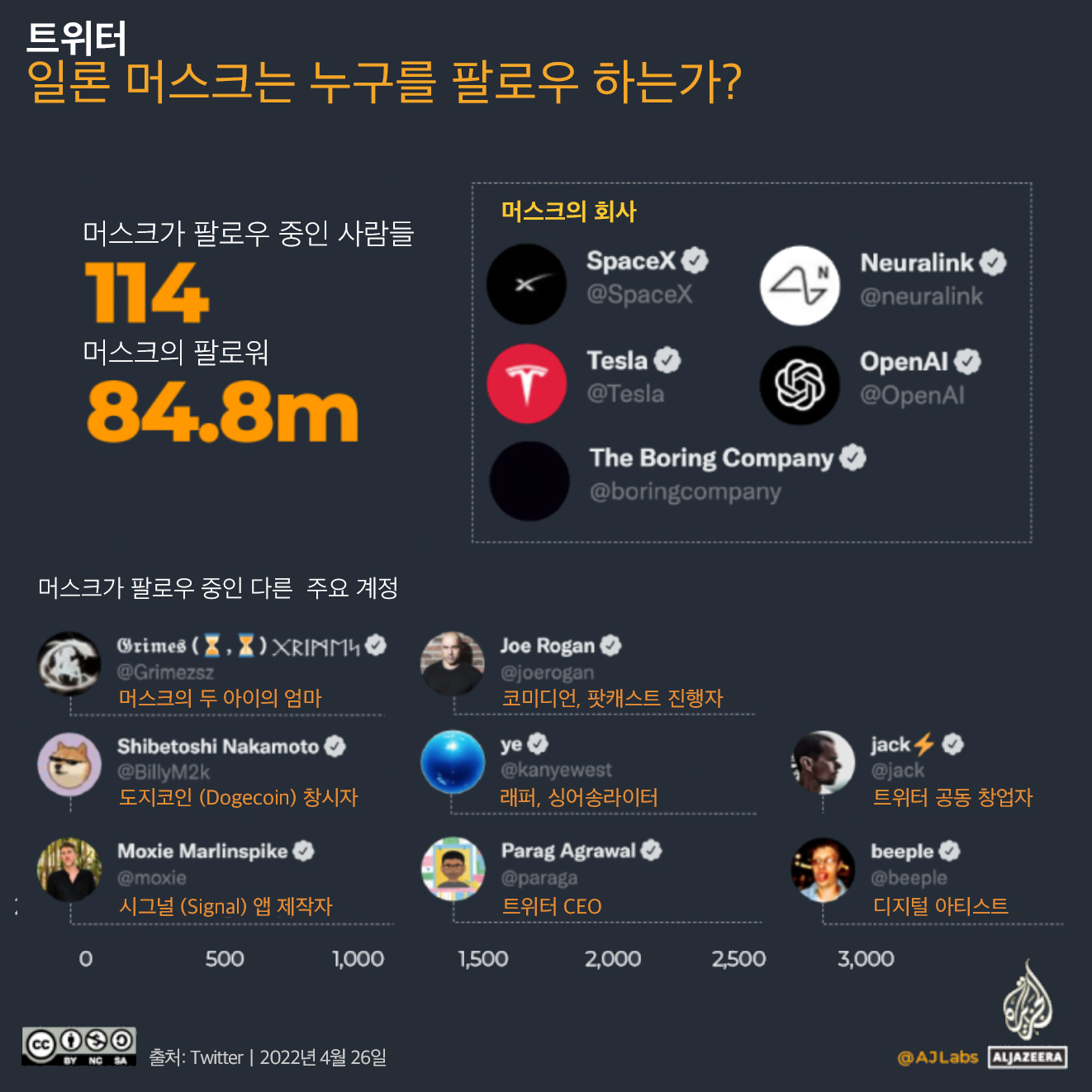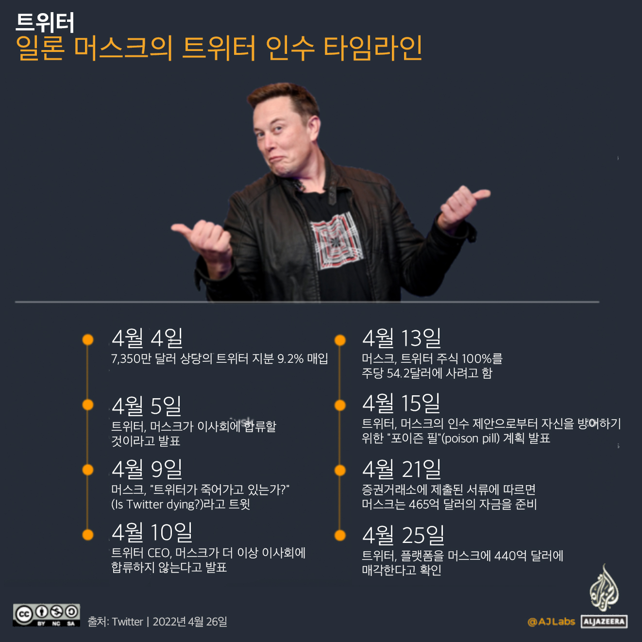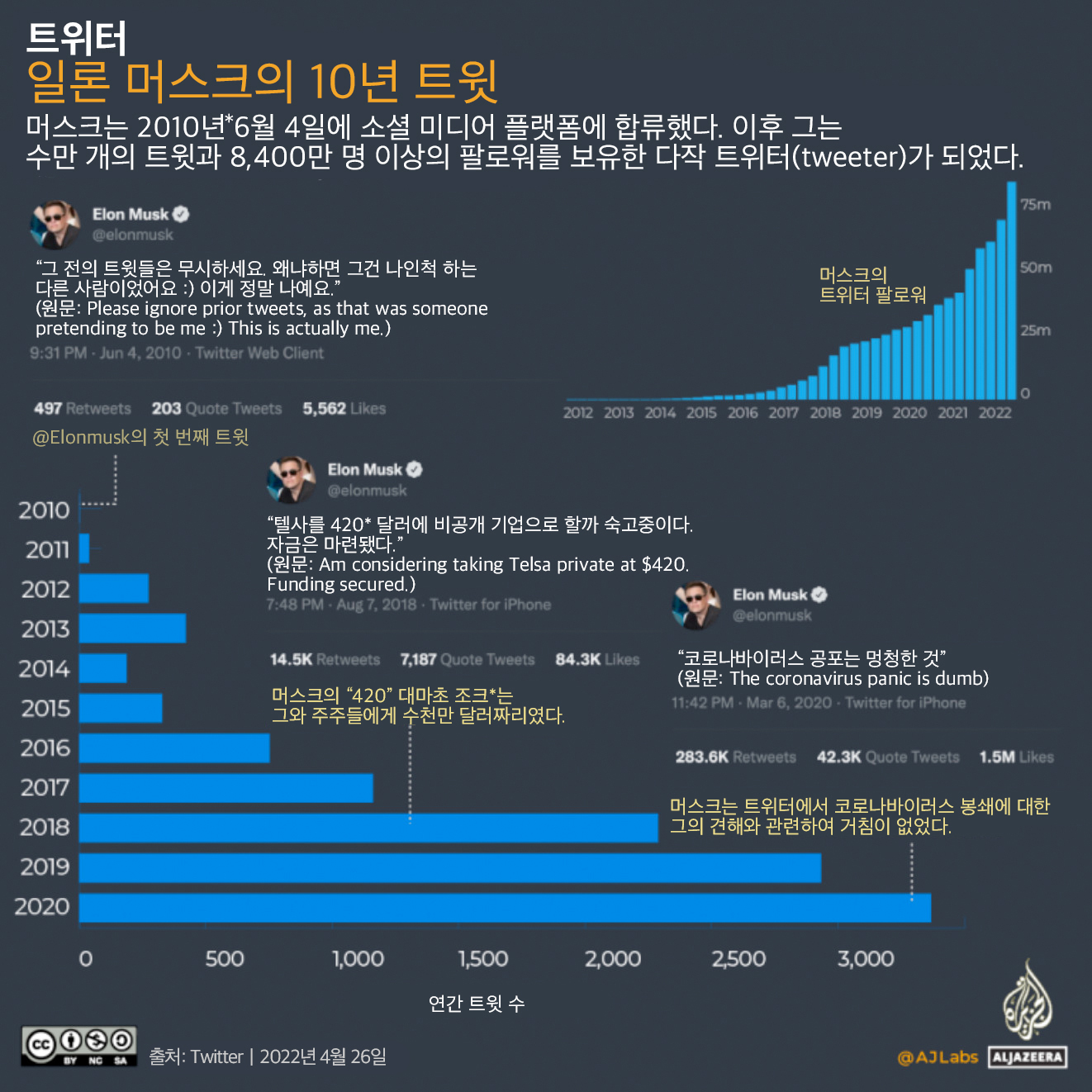 * 역자 주: 반발에도 불구하고 머스크가 드디어 트위터를 440억 달러에 인수하게 되었다. 그의 인수는 일종의 연대기 기록자와 실시간 팩트체커로서의 소셜미디어 공론장에서 트위터 플랫폼에 대한 위협이 될 수 있다. 한 게시물의 효과가 떨어지기 시작하는 소위 반감기는 페이스북은 5시간, 인스타그램은 20시간, 링크드인은 24시간, 유튜브 동영상은 20일이지만 트위터는 20분에 불과해 실시간 팩트체커의 기능을 한다. 또한 대화의 일부인 트윗은 시간순으로 표시되며, 트위터 아카이브는 모든 공개 트윗에 즉각적이고 완전한 액세스를 제공한다. 이러한 기능들은 소셜미디어 공론장에서 트위터를 기록의 역사적 연대기 기록자이자 팩트체커로 위치 지운다. 그러나 그는 편집을 허용하지 않는 트위터에 편집 기능을 추가하고 수익창출을 지금의 광고가 아닌 구독 모델로 바꾸고, 트위터를 비공개 기업으로 만들겠다고 주장해 왔다. 이러한 변경은 허위정보를 유포하고 혐오와 갈등 콘텐츠를 거르는 트위터의 콘텐츠 조정(content moderation) 방식의 완전한 폐지나, 머스크 자신의 자동차와 항공산업에 대한 불리한 정보의 유포 금지를 통해 이해상충을 불러일으킬 수 있다. 트위터가 새로운 소유자를 만나면서 과연 어떻게 변할지 우리는 아직 알 수 없다. 그 변화를 이해하기 위해서 우선 머스크의 트위터 역사와 관계에 대해 알 필요가 있다. 이 글은 Al Jazeera의 4월 26일 자 기사 Infographic: What has Elon Musk said on Twitter? 의 번역으로 머스크의 트위터 인수 타임라인, 주요 트윗 내용, 팔로잉 중인 계정에 대해 설명하고 있다.