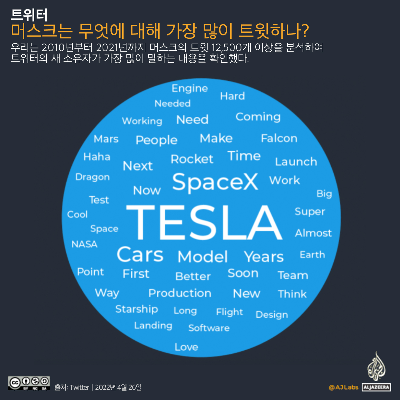 알 자지라는 2010년부터 2021년까지 머스크의 트윗 12,500개 이상을 분석하여 트위터의 새 소유자가 가장 많이 말하는 내용을 확인했다.