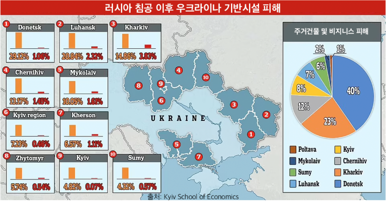 키이우 경제대학(Kyiv School of Economics, KSE)의 초기 분석에 따르면 물리적 피해는 이미 4월 1일 현재 680억 달러를 넘어섰으며 이는 2021년 우크라이나 GDP의 3분의 1 이상에 해당한다. 4월 26일 현재 피해액은 703억 달러로 증가했다.