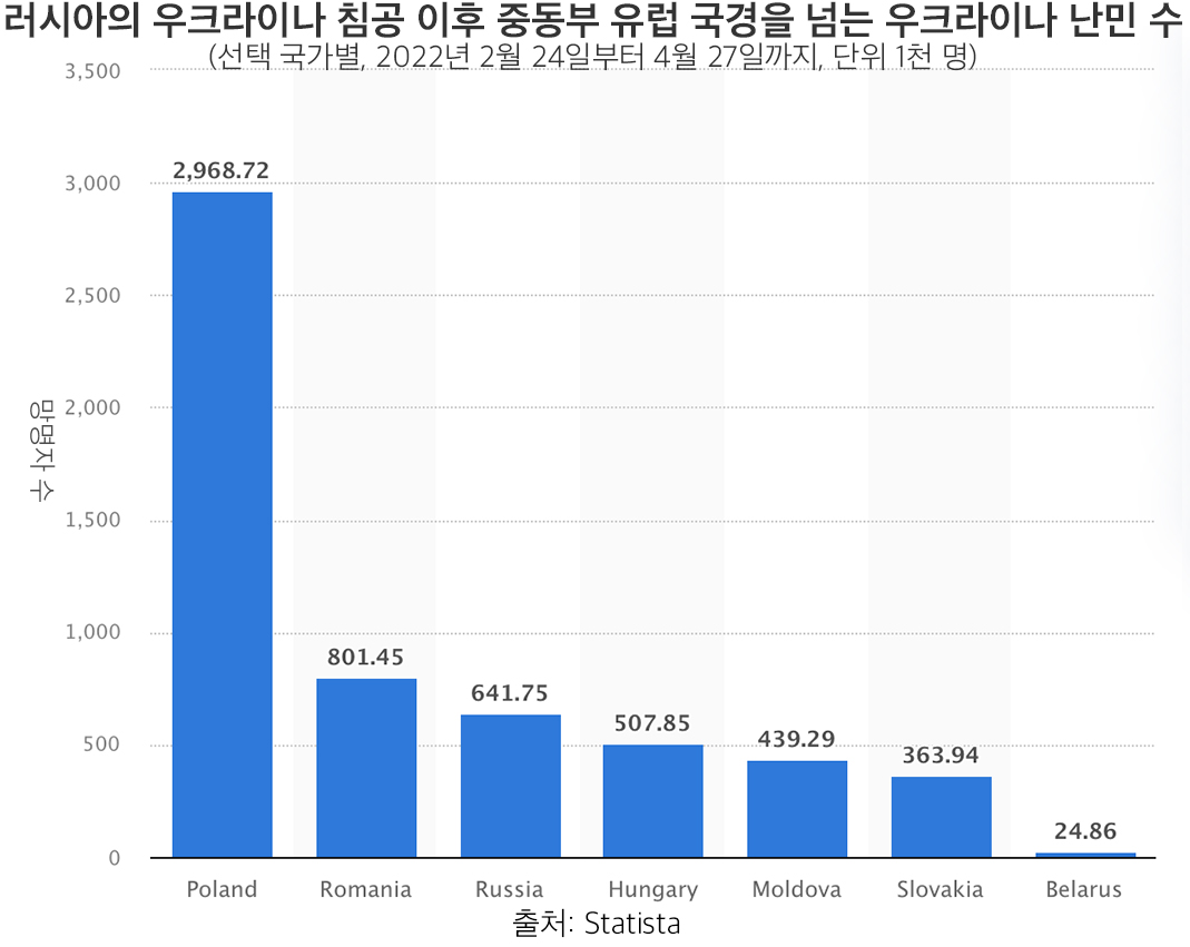 유엔과 세계경제포럼(WEF)에 따르면, 지금까지 1,100만 명 이상의 사람들이 우크라이나에 집을 떠났고, 그중 530만 명은 이웃 나라로 떠났으며, 650만 명의 사람들은 전쟁이 계속되는 가운데 현재 우크라이나 내에서 실향민이 되었다. 유엔 아동 기구에 따르면 모든 우크라이나 아이들의 3분의 2가 영향을 받아 그들의 살던 집을 떠나 피난에 올라야 했다. 현재 가장 많은 우크라이나 난민을 수용하고 있는 나라는 폴란드로 4월 27일 현재 약 300만 명의 우크라이나 난민을 받아들였다.