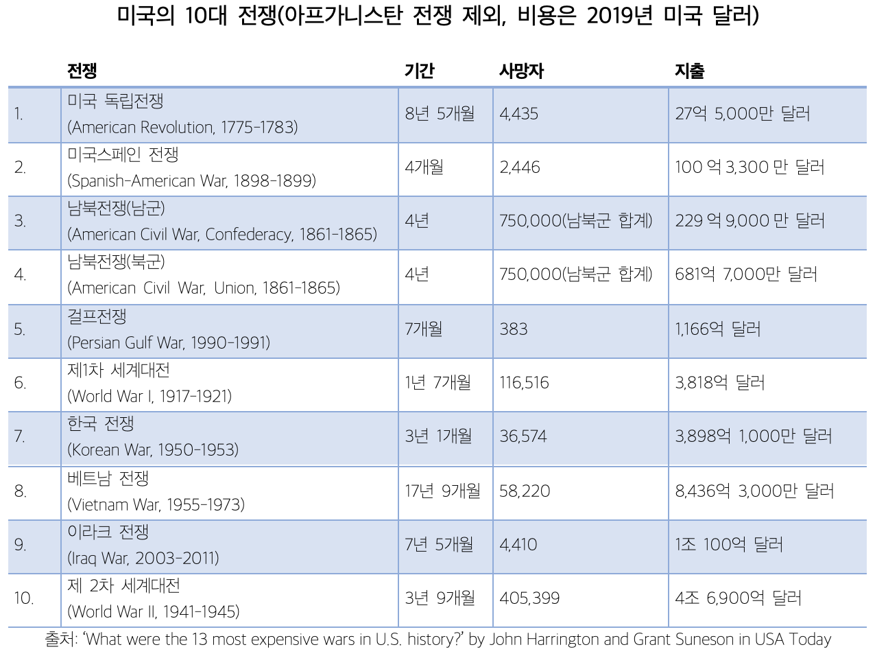 전쟁의 비용과 피해는 단순히 그 전쟁에 들어간 각종 군사적 비용, 인명 손실만으로 그리고 당대의 손실만 환원될 수 없다. 미국의 전문가들은 9/11 이후 미국이 전쟁에 투여한 재원을 약 8조 달러로 추정한다. 이 비용은 2001년 당시 6조 달러에 불과했던 미국 정부의 부채가 20년 두에 28조로 증가하는데 결정적인 기여를 했다. 17년 9개월의 베트남 전쟁 당시 미국은 2022년 기준으로 약 1조 3천 억 달러를 투여했다. 문제는 이로 인해 미국은 막대한 달러 유출로 금본위제를 실질적으로 폐기하고 1980년대 본격화된 신자유주의적 정책의 포문을 열어 실질 임금 하락과 양극화 심화의 계기가 되었다. 따라서 전쟁 비용을 단지 당대의 군사적 비용과 인명 손실에 국한하는 협소한 시각을 넘어 당대와 향후 경제 및 사회에 미치는 영향을 함께 고려할 필요가 있다.