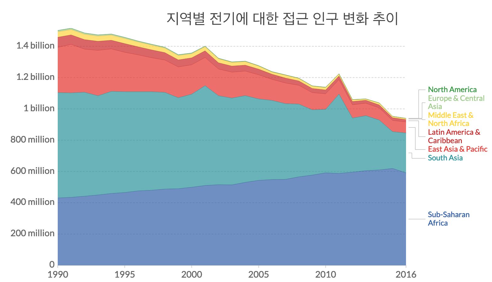 지난 수십 년간 지역적으로 전기 접근이 변화한 것을 볼 수 있다. 1990년, 전기에 대한 접근이 제한된 전 세계 인구의 거의 절반(45%)이 남아시아에 살고 있었다. 2016년에 이르러 이것은 크게 변화하였다. 현재 가장 큰 점유율은 사하라 이남 아프리카(현재 전기에 대한 접근이 제한된 전 세계 인구의 거의 3분의 2가 거주하는 지역)에 살고 있다.
