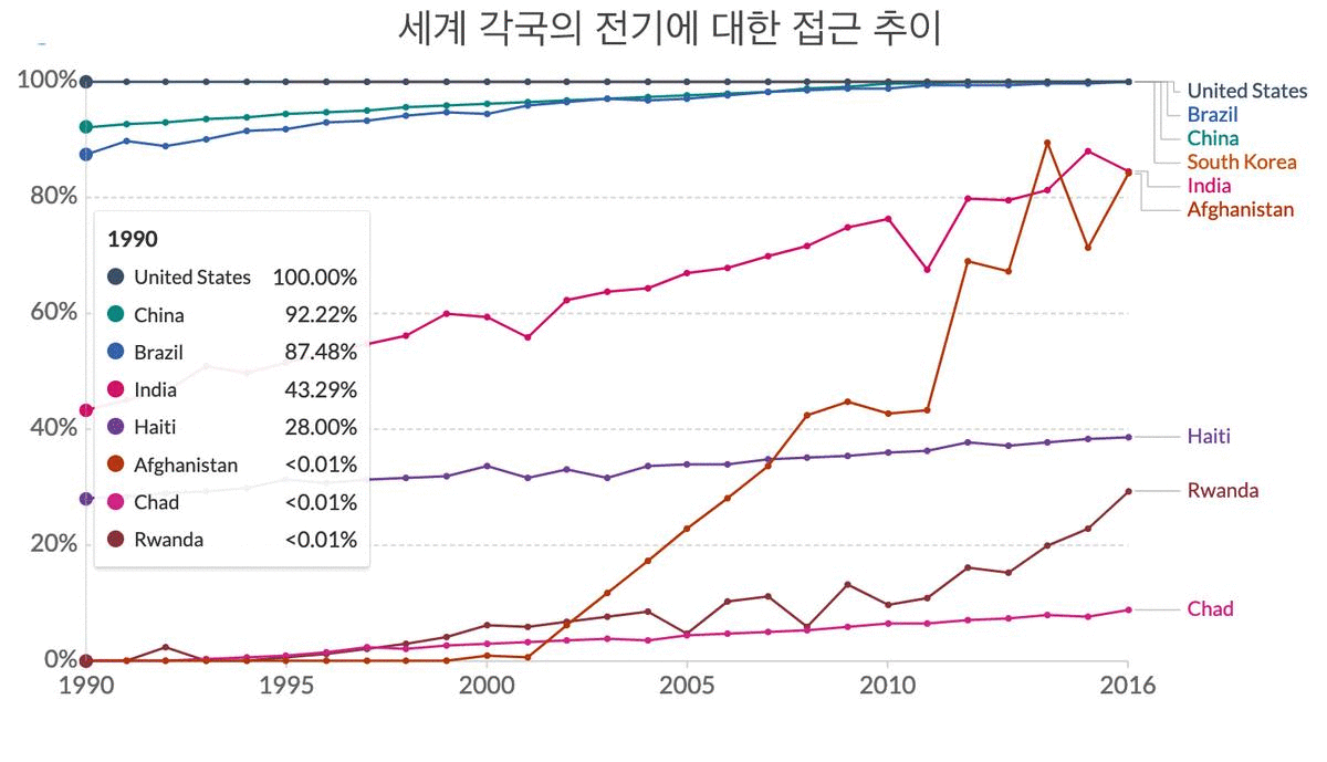 대부분의 국가에서 이러한 추세는 상승하고 있지만, 여전히 많은 국가는 심각하게 뒤처져 있다. 이 스펙트럼의 가장 낮은 곳에 위치한 차드(Chad)는 아직 인구의 8.8%만이 전기를 사용할 수 있다. 일부 국가에서는 향후 수십 년 동안 전기에 대한 접근 개선이 시급한 과제로 남아 있을 것이다.