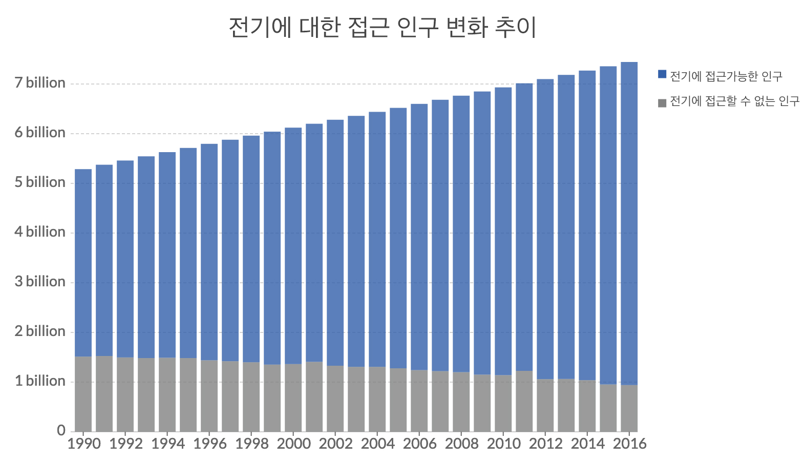 2015년에, 전기에 접근할 수 없는 사람들의 수는 수십 년 만에 처음으로 10억 아래로 떨어졌으며, 이는 전기 생산 역사상 처음일 것이다. 1990년에는 15억 명 이상이 전기를 사용하지 못했다. 그 숫자는 2015년에는 9억 5천 2백만 명, 2016년에는 9억 4천만 명으로 다시 감소했다.