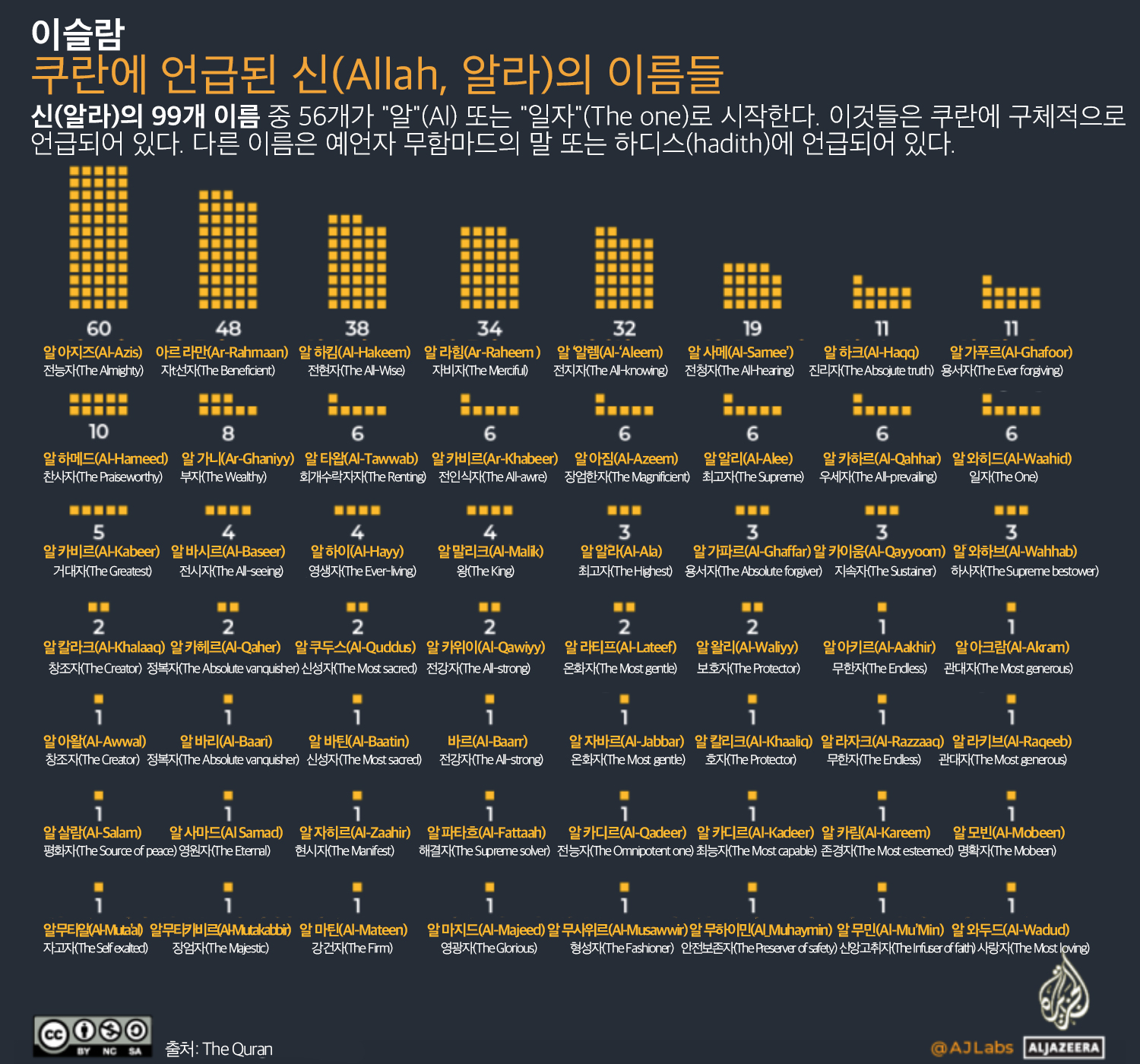 신(알라)의 99개 이름 중 56개가 "알"(Al) 또는 "일자"(The one)로 시작한다. 이것들은 쿠란에 구체적으로 언급되어 있다. 다른 이름은 예언자 무함마드의 말 또는 하디스(hadith)에 언급되어 있다.