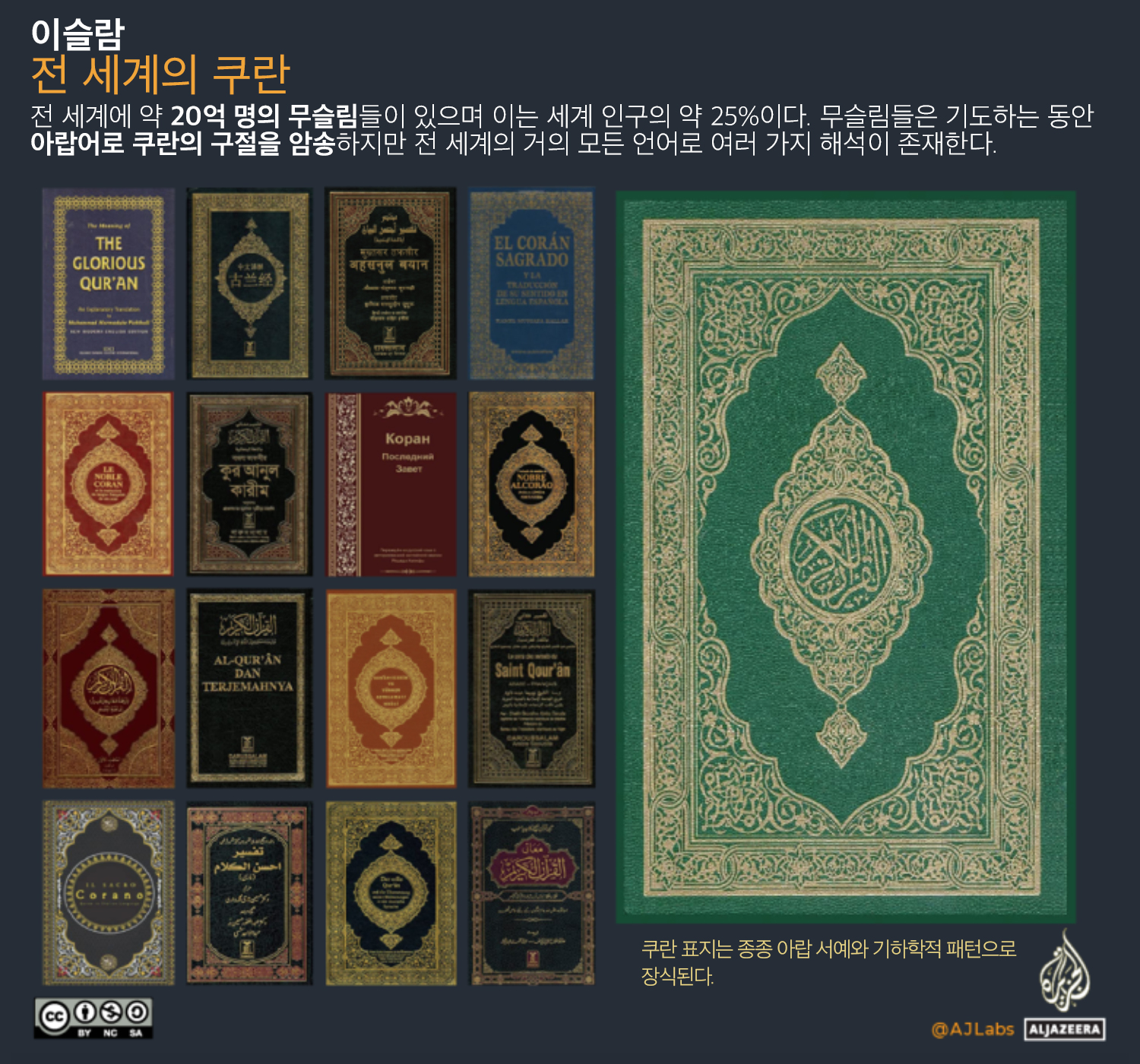 아래 그래픽은 세계에서 가장 많이 사용되는 언어로 된 쿠란 번역의 표지를 보여준다.